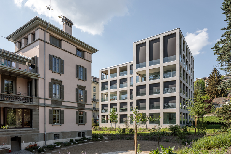 Das Volumen gründet auf der horizontalen, wie auch vertikalen Staffelung der Grundrisse, vermittelt zwischen den unterschiedlichen Massstäben der Umgebungsbauten und bildet eine Referenz zur historischen Architektur der benachbarten Villa Halde.