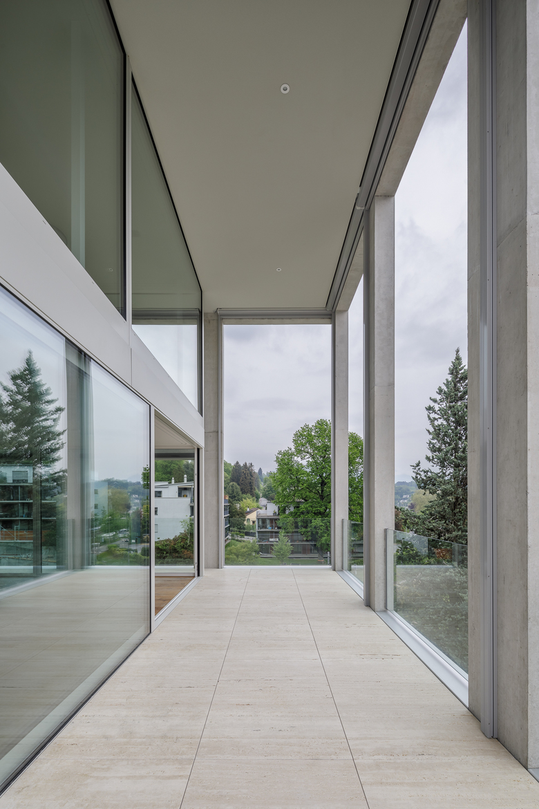 Das vorgelagerte Fassadenraster dient als Filterschicht zur unmittelbaren Umgebung. Diese Schicht erweitert den Innenraum, verhilft den Bewohnern zu einer erhöhten Intimität, ist sommerlicher Wärmeschutz, bildet die Statik und wird zum tektonischen Kleid aus Sichtbeton.