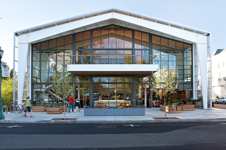 Envisioned as a contemporary grange, where people come together to share food, stories and local knowledge, this modern interpretation of the traditional barn typology houses a market café, mercantile store, and meeting space. Sustainability is central to the design, which incorporates a resource efficient prefabricated metal structure, thermally efficient insulated metal panel cladding, and a naturally ventilated interior. Glazed garage doors on two levels open up the interior to the outdoors, connecting occupants to the urban life in front, and to the restored creek- side riparian habitat along the building’s west façade.