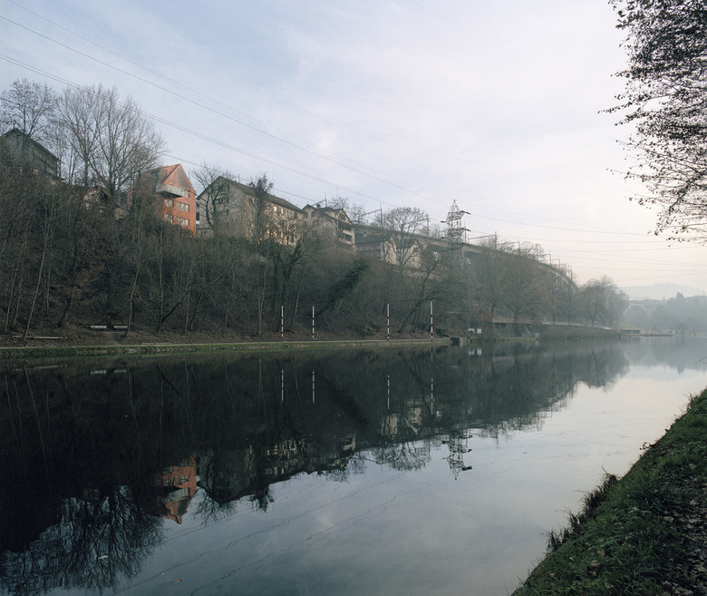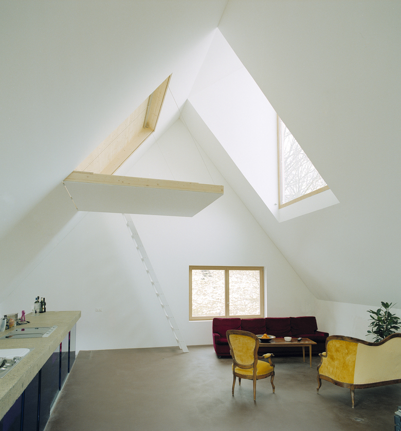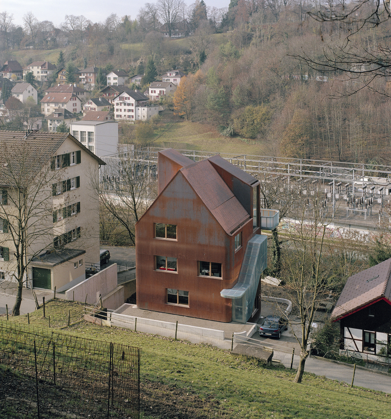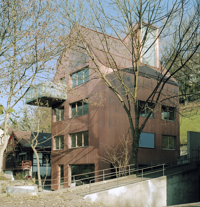 Das Haus befindet sich an der unteren Jurastrasse in Bern in in unmittelbarer Nähe der Aare. In der Umgebung gibt es einerseits eine Schafweide, einen grossen Garten mit Abendsonne, den bewaldeten Hang zur Aare und andererseits die Sicht auf Fluss und Stadt. Die Parzelle wurde 1999 von der Stadt Bern zur Übernahme im Baurecht ausgeschrieben. Das Projekt wurde aus acht Eingaben ausgewählt und hat sich seitdem weiterentwickelt um eine Flexibilität zu erreichen die sowohl unabhängiges wie gemeinschaftliches Wohnen ermöglicht.Das Haus übernimmt die punktuelle Struktur des Quartieres und entwickelt sich auf 80 m2 Bodenfläche in die Höhe wie ein kleiner Turm. Das Gebäudeinnere ist in zwei Wohnungen mit je zwei Stockwerken gegliedert.Der strassenseitige Eingang der Gartenwohnung führt ins Erdgeschoss mit drei Zimmern, Badezimmer und Dusche. Eine Innentreppe führt nach unten ins Gartengeschoss mit Wohnküche und Zugang zum Garten.Die Dachwohnung erreicht man über eine Aussentreppe an der Nordfassade.Im Obergeschoss befinden sich zwei Zimmer und zwei Badezimmer. Die Innentreppe führt ins Dachgeschoss mit Wohnküche in einem offenen Dachraum mit bis zu 6 m Höhe. Eine grosse Dachlukarne im Süden dient der Besonnung des Raumes. Ein Gästebett kann aus der Dachfläche in den Raum der Lukarne geklappt werden. Die zweite Lukarne im Norden bildet den Essplatz mit Aussicht auf das Aaretal. Auf der Gartenseite liegt der grosszügige Balkon.Die Tektonik drückt die vorstädtische Atmosphäre des Quartieres aus. Das Gebäude ist vom Sockel bis zum First mit Kupferwellblech überzogen. Das Kupfer hat sich innert Jahresfrist ins Dunkelbraun gewandelt und wird sich weiter wandeln.