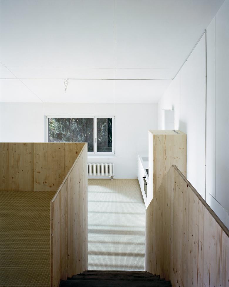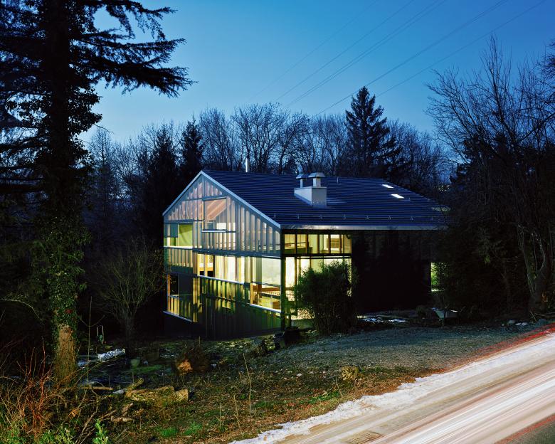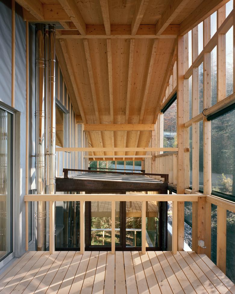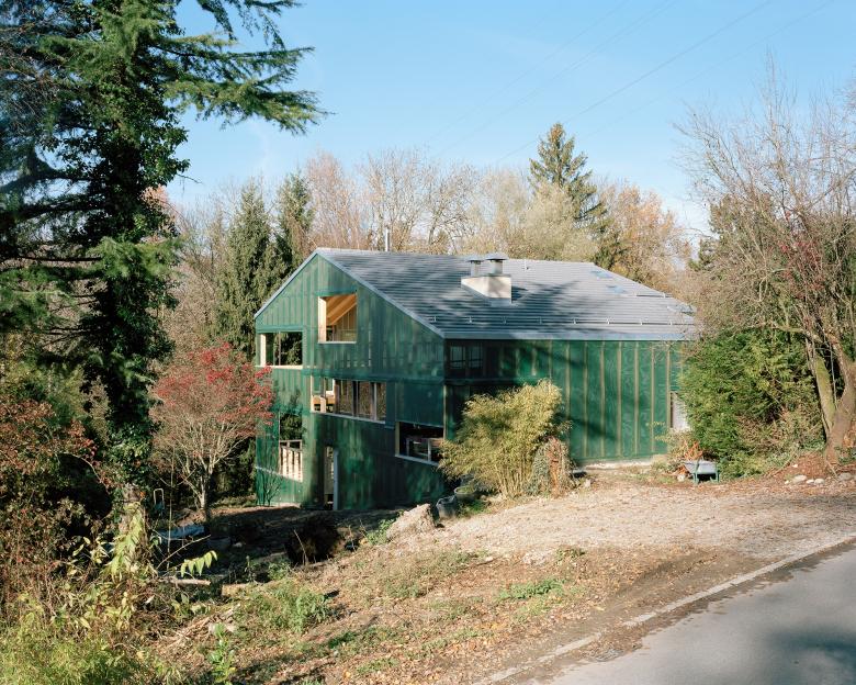 Das bestehende Haus aus den sechziger Jahren wurde um ein Geschoss erhöht, wärmegedämmt und mit einer neuen textilen Gebäudehülle eingekleidet. Die Aufstockung und die Wärmedämmung des bestehenden Gebäudes wurden mit einer filigranen Holzkonstruktion realisiert. Zwischen dem inneren beheizten Baukörper und der textilen Gebäudehülle ist eine grosse Veranda mit Aufenthaltsbereichen auf drei verschiedenen Ebenen entstanden. Im Innern wurde über der bestehenden Wohnung eine zusätzliche Wohnung geschaffen, welche den Splitlevel des Gebäudes übernimmt. Mit seiner dunkelgrünen Farbe integriert sich das Gebäude in der verwachsenen Umgebung.