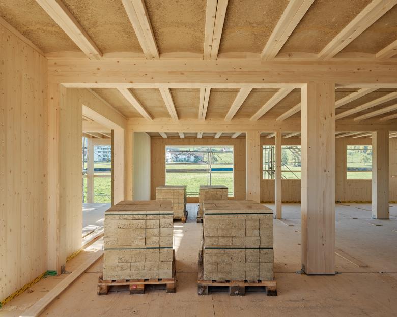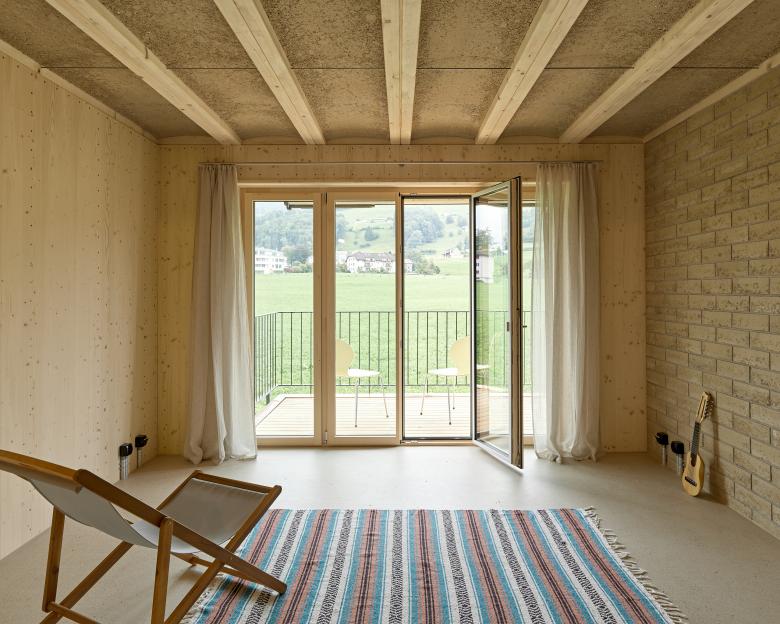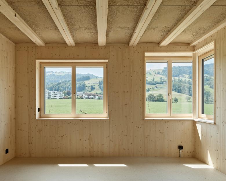 Ziel des Projektes war ein pragmatisches Gleichgewicht zwischen Ökologie und Ökonomie, damit Energie, Ressourcen und Finanzmittel möglichst sparsam eingesetzt werden können. Die Gebäudeform entspricht den historischen Bauernhäusern in der Umgebung, das grosse Dach schützt das Gebäude und dient der Elektrizitäts- und Wärmeproduktion. Die Tragstruktur des Gebäudes ist ein einfacher Holzrahmenbau mit robotergestampften Holzlehmdecken der Firma rematter. Der nichttragende Stampflehm zwischen den Holzrippen dient dem Brandschutz, dem Schallschutz, sowie dem Temperatur- und Feuchtigkeitsausgleich. Die Holzfassade wird leicht karbonisert und geölt, damit das Material auf natürliche Weise geschützt ist.