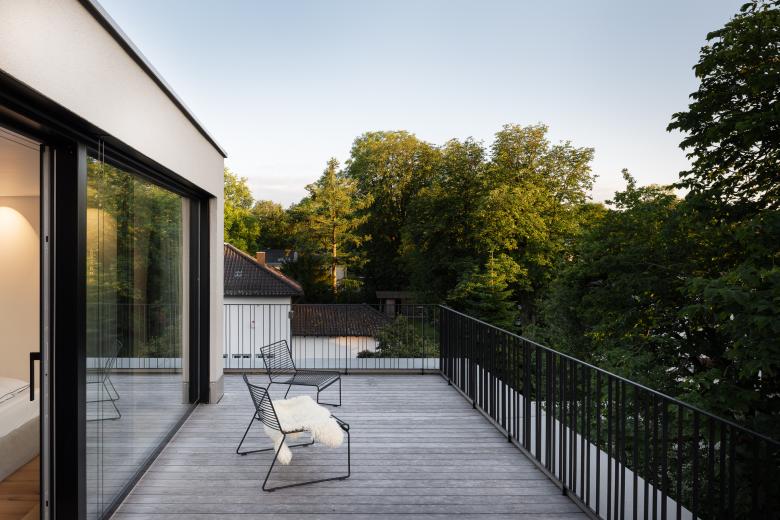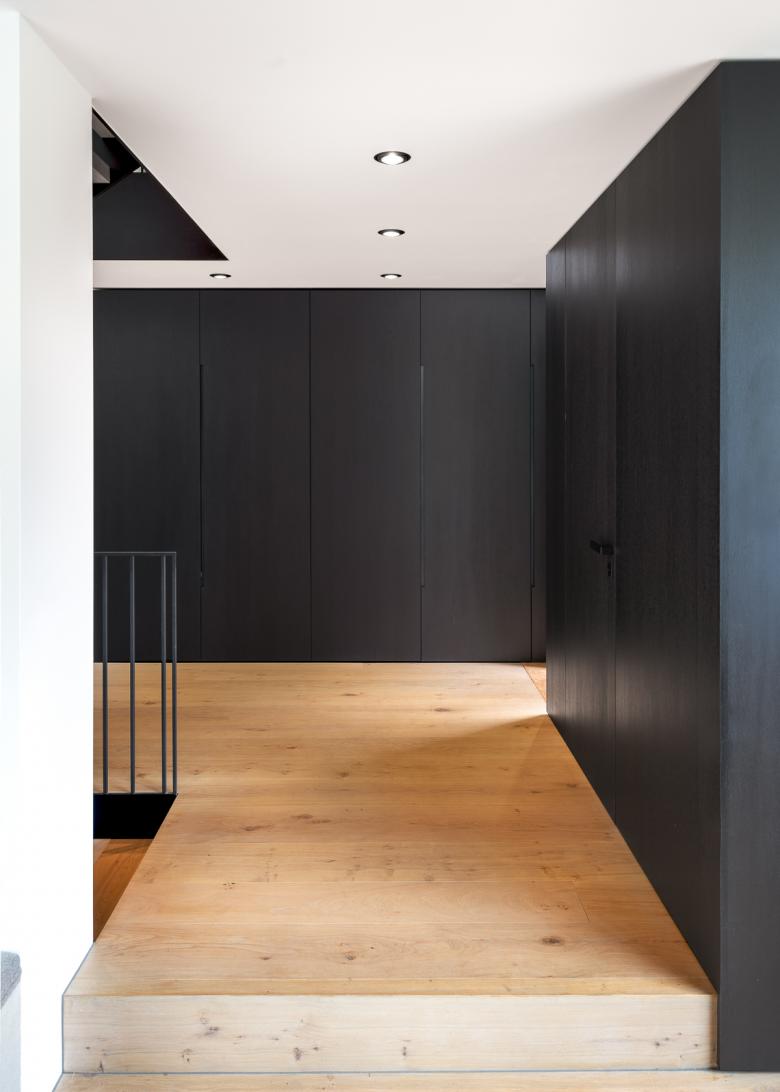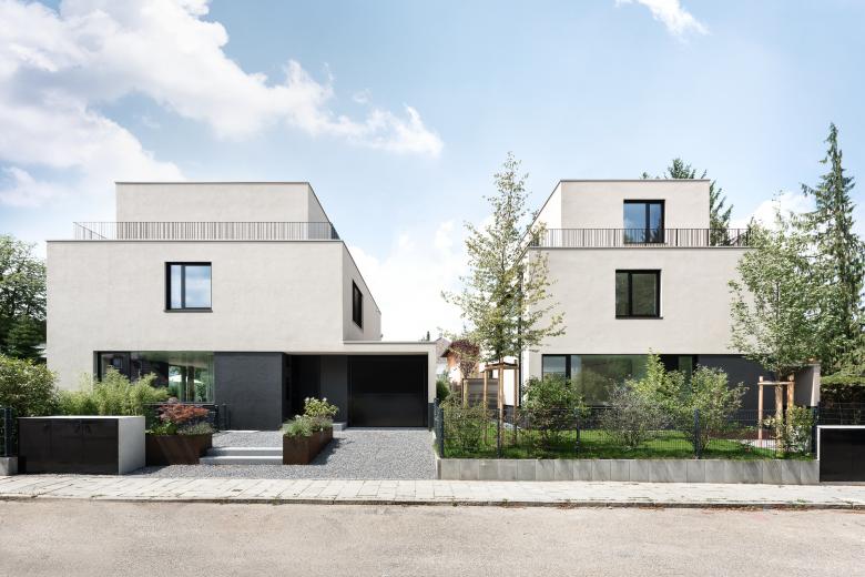 Both of the two houses possess the same conceptual design and built with the same materials, yet are entirely different from one another in terms of spatial arrangement and user experience. Stacked off-white rendered cubes sit on top of a black 'skirting' that envelope the house. Larger windows sit between the two contrasting colours and the smaller windows punch through the upper cubes. The concept makes an appealing and ever-changing appearance to each façade.