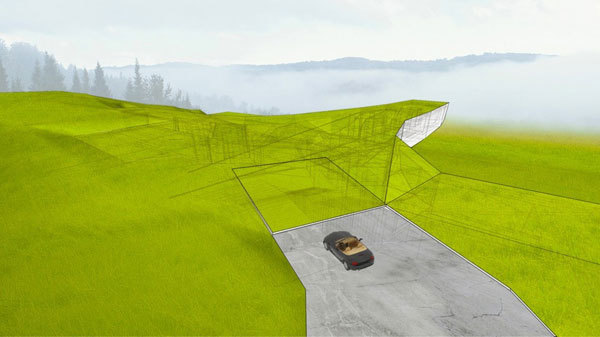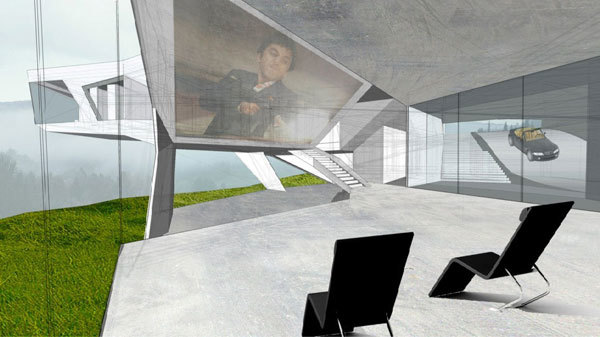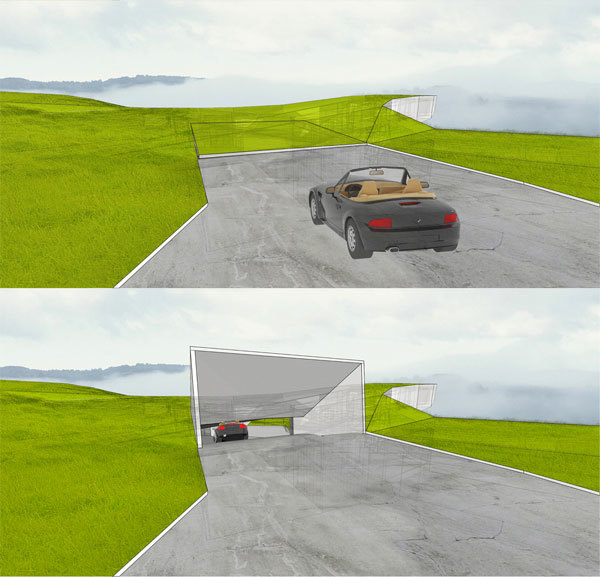 The house will be situated in Lower Silesia, in a post-german city, where the majority of buildings are steep roofed villas. Under ground there are thousands of kilometers of partly buried tunnels, which became the starting point of the design idea. The building integrates with its surroundings, yet it does not refer to the visible structure, but the underground part of the city. The plot, where the house is designed slopes steeply to the south. The object's structure has been hidden underground, what in turn has made it completely invisible from the driveway. A huge trapdoor covered with grass is the entrance to the building. The driveway leads underneath the ground, to the living room, which is situated on the same level as a garden. The sleeping part have been situated on a lifted, 25 meters long cantilever.