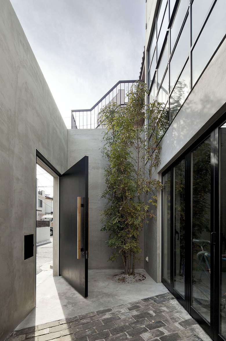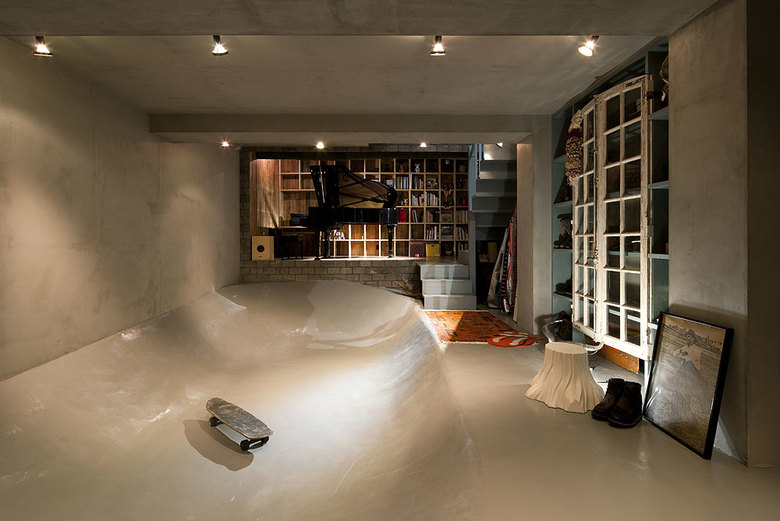 スケートボードのバンクと、ピアノ室を取り入れた住宅である。外部の庭と一体になるスケートボードバンクに、フロアレベルを高くし、フルオープンできる防音扉で仕切られたピアノ室をレベルを変えて配置した。その防音扉を開け放つことで、ステージに変わり、バンクは客席となり、また違った空間へと変わることとなる。また、ピアノ室のフロアレベルの操作が、その下部の地下や上部のLDKにもフロアレベルのズレを与えている。このズレが空間を曖昧に分節し、緩やかに連続させるとともに、更なる奥行きを生み出し、空間を豊かにしている。