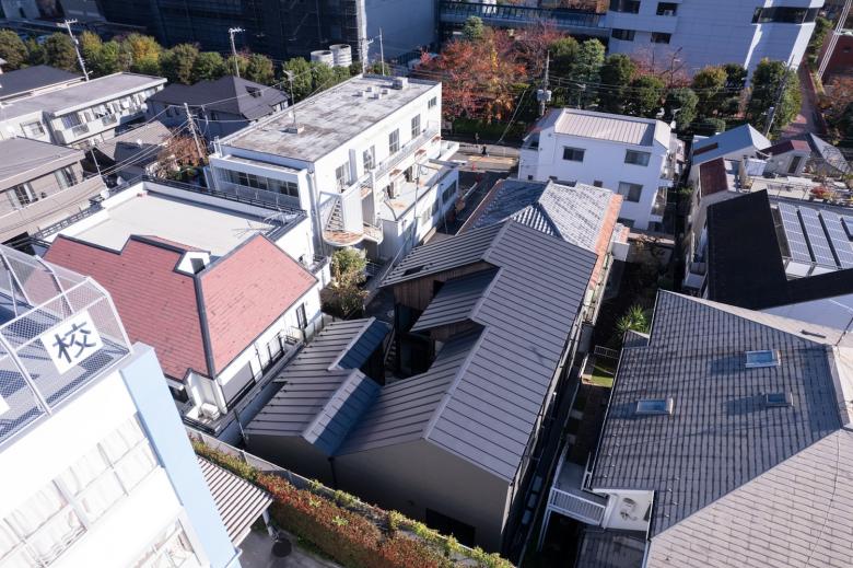 計画建物は第一種住居専用地域に立地するが故、最も厳しい日影規制の制約を受ける。採光とプライバシー確保の検討の結果、導き出された複雑な平面形態は複合建物のようで、建物のあらゆる部分が複合して日影を作り出す。敷地内通路の開放感や、室内の採光や眺望の要である西側の屋根は谷状に低くすることに決めて、その他部分の屋根は日影規制に適合させるため、出来るだけ複合日影を作り出さないように微細な高さ調整をした。結果、建物のボリュームは様々な高さや勾配を持つ切妻屋根が連なりつつ雁行する形状になった。