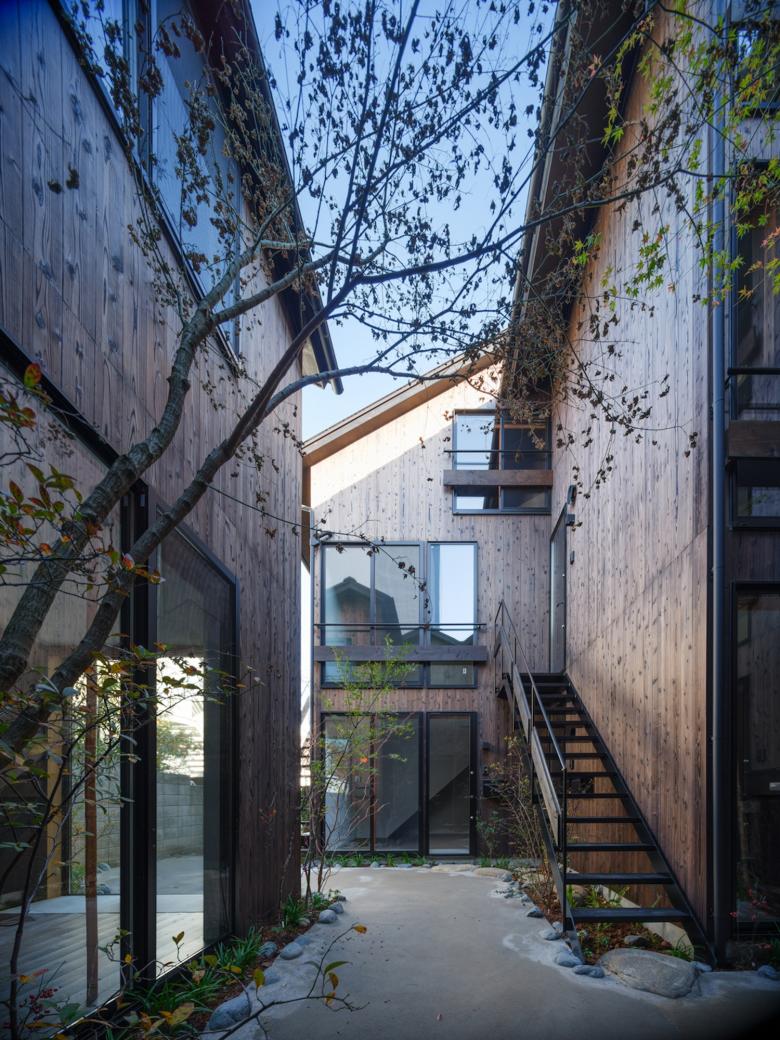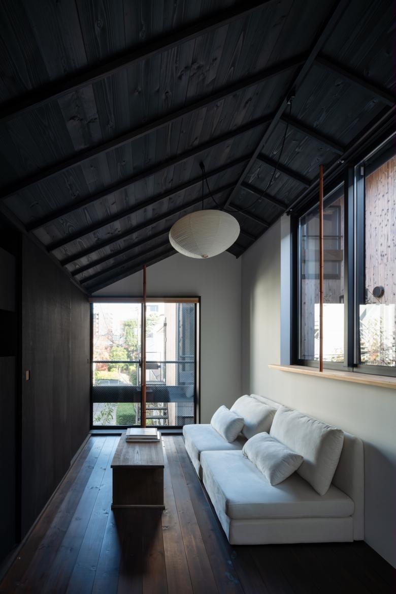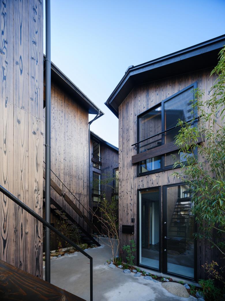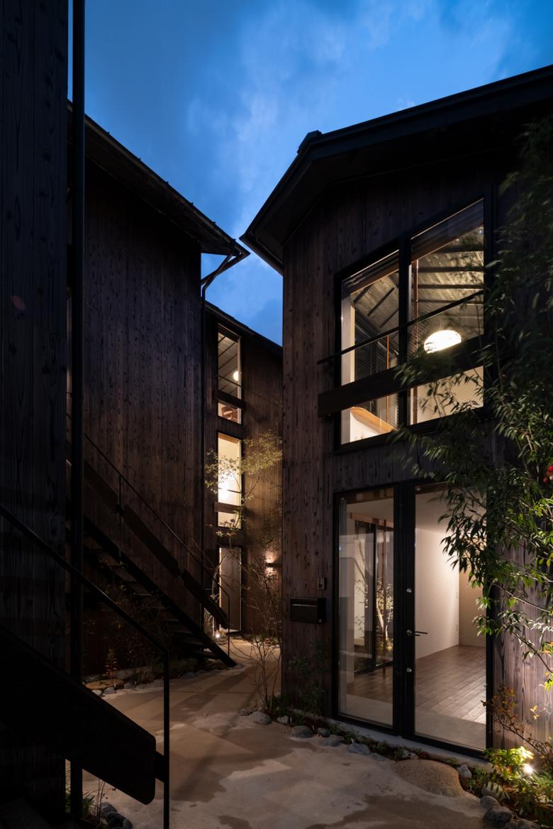 敷地内通路に身を置けば、切妻屋根が連なりつつ雁行する建物は連なる山々に見えてくる。外壁は建物が逆光に映える夕山に見えるように黒っぽい焼杉にした。山間に身を置いていると、今自分が居る敷地内通路が露地に思えてくる。真砂土舗装にして山の雑木や山野草を植え、山間的情緒の中を見え隠れを楽しみつつ、踏石や飛び石を介して各室へアクセス出来るようにした。室内に身を置けば、窓を通して見える外の風景は、山の雑木が枝垂れ掛かり、山を借景とした茶庭に見えてくる。敷地内通路を向く窓にはアルミサッシの障子を隠すように竹方立を立て、隣地を向く窓には掛障子を設え、隣家のノイズを遮蔽しつつ室内に陰影をもたらすようにした。間仕切は土壁にした上で、枠の一方を突き出し角柄窓に見えるようにした。最上階の部屋の屋形天井からは和紙照明が吊られ、外部からは露地行灯のように見えるようにした。