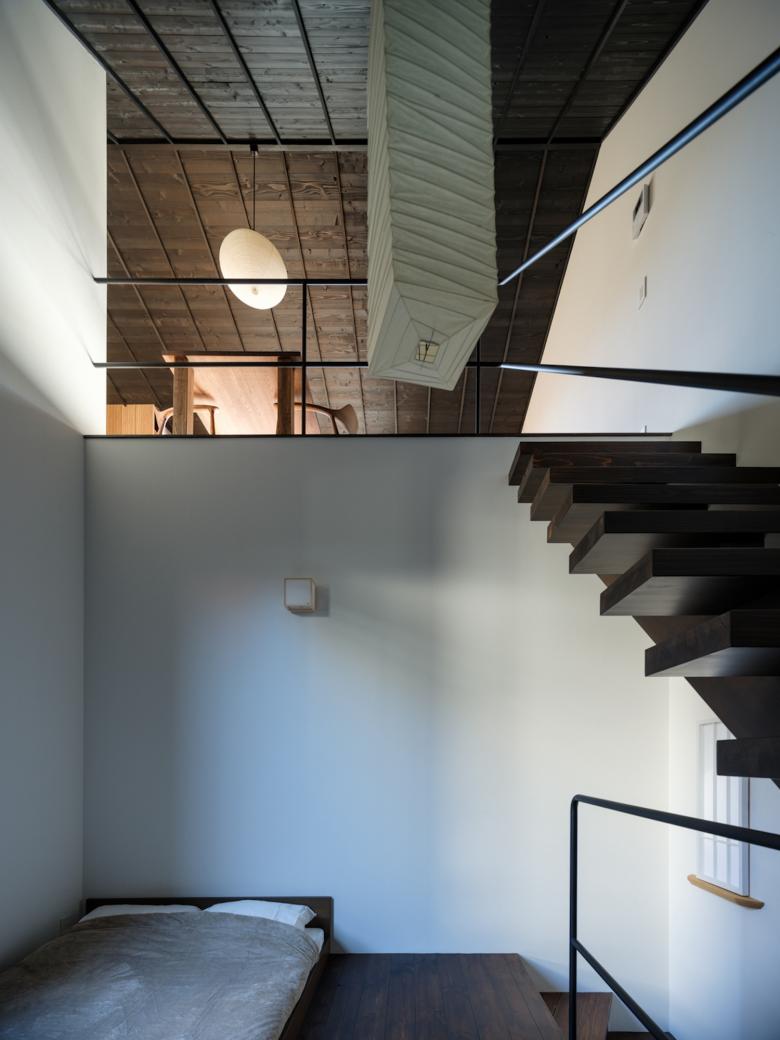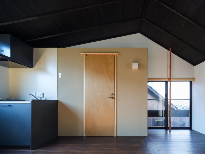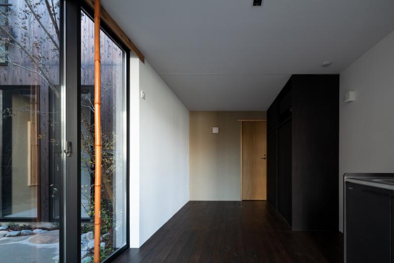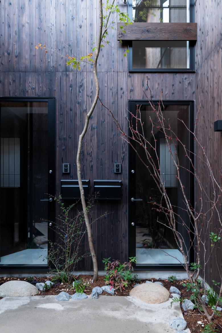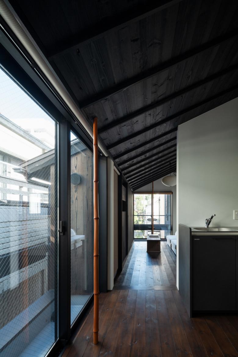 敷地内通路に身を置けば、切妻屋根が連なりつつ雁行する建物は連なる山々に見えてくる。外壁は建物が逆光に映える夕山に見えるように黒っぽい焼杉にした。山間に身を置いていると、今自分が居る敷地内通路が露地に思えてくる。真砂土舗装にして山の雑木や山野草を植え、山間的情緒の中を見え隠れを楽しみつつ、踏石や飛び石を介して各室へアクセス出来るようにした。室内に身を置けば、窓を通して見える外の風景は、山の雑木が枝垂れ掛かり、山を借景とした茶庭に見えてくる。敷地内通路を向く窓にはアルミサッシの障子を隠すように竹方立を立て、隣地を向く窓には掛障子を設え、隣家のノイズを遮蔽しつつ室内に陰影をもたらすようにした。間仕切は土壁にした上で、枠の一方を突き出し角柄窓に見えるようにした。最上階の部屋の屋形天井からは和紙照明が吊られ、外部からは露地行灯のように見えるようにした。