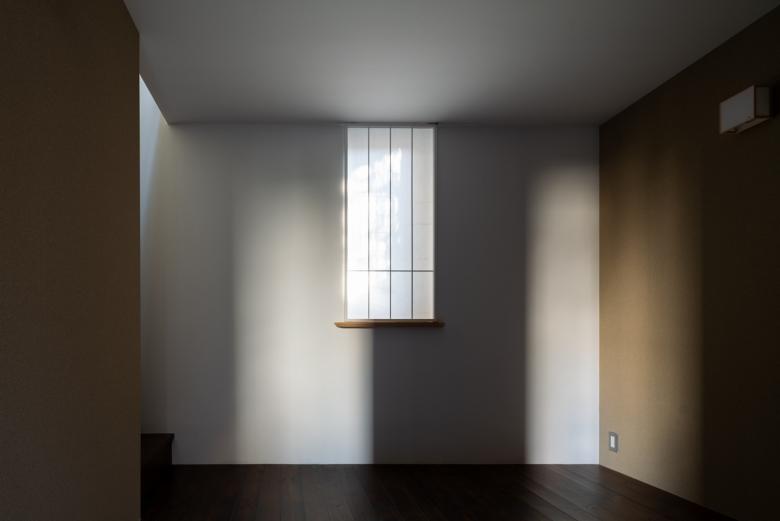 敷地内通路側の窓は庭の鑑賞、隣地側の窓は1・2階は遮蔽と陰影、3階は見晴らしが主たる目的であり、各開口部のディテールは、それが位置する階と方位、目的に応じて異なる。3階の敷地内通路側に位置するこの掃き出し窓は、右縦枠が戸当たりを兼ねることで四方枠を収納とL型に一体化、外部の花台が内部の手摺を兼ね、屋形天井に刺さる竹方立はアルミサッシの召合わせを隠しつつ、杉幕板のカーテンボックスとセットで十字をつくる。アルミサッシの存在や各部分の機能を背景化しつつ、庭の風景と建築素材を前景化させた。