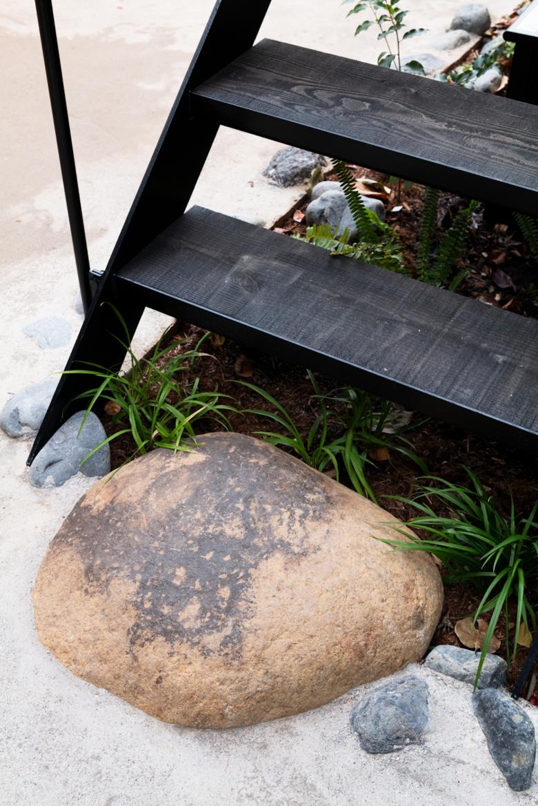 デザインはここで終わらない。 以上が人間の知覚や身体感覚を抜きにした、数学的あるいは物理的な記述に依拠した客観的外部世界のデザインだとすれば、これを出発点として、空間体験の記述に依拠した、個々人が知覚や身体感覚を通して生き生きと体験される現象学的世界のデザインに到達しなければならない。入居者にとって集合住宅は、個別の専有室内部と共用外部を含むそれ以外の建物全体という入れ子構造として体験される。蓮山居のディテールは、両者を茶室と露地の関係に見立て、後者が前者にとって、都市とのバッファーであり、通路であり、鑑賞対象でもあるような、現象学的ダイナミズムを生み出すようにデザインされることになる。都会の喧騒の中、ぽっかりと空いた袋小路の突き当たりの閉塞感は、文字通り「市中の山居」に生まれ変わるのである。