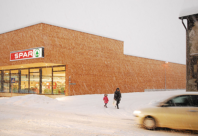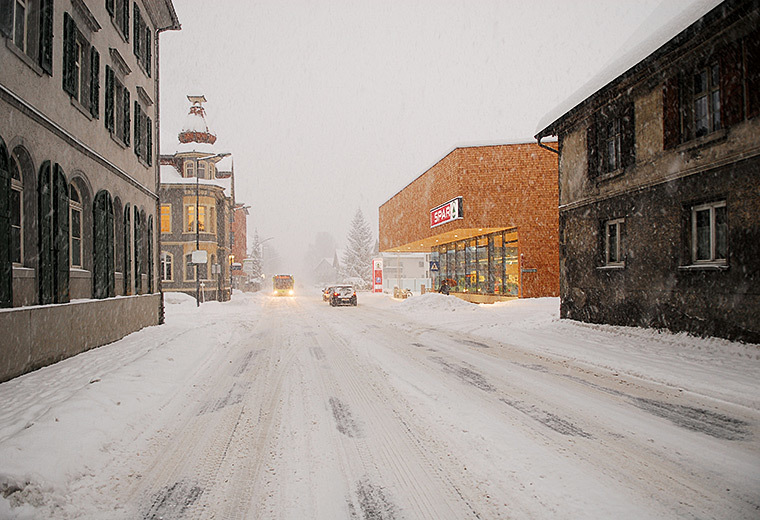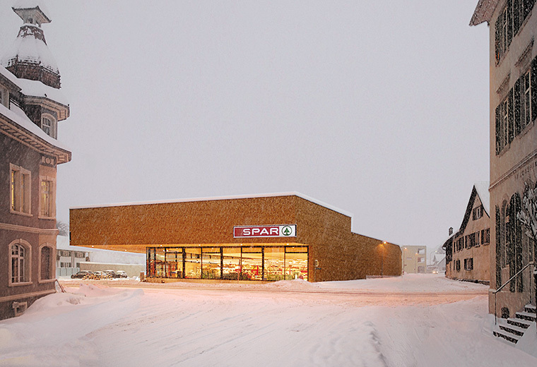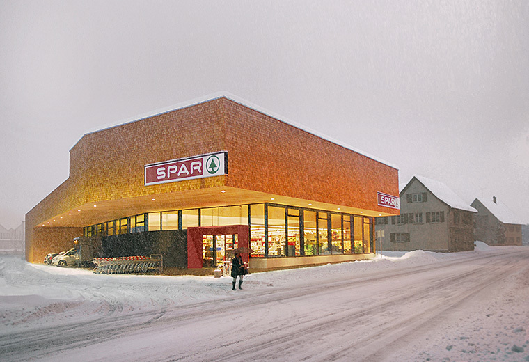 Eine geschindelte Markthalle im Zentrum von Lauterach. Der neue Sparmarkt ergänzt ein Geviert von unterschiedlichsten Häusern in einem Kreuzungsbereich, der L 190. Eine Lücke im Ortsbild wurde geschlossen, der Straßenraum wird durch den Baukörper gefasst. Das historische Gasthaus Kreuz, das alte Kloster - ein ehemaliges Bürgerhaus aus dem Jahr 1850 - mit der dazugehörenden Kirche und ein bestehender Bauernhof bilden das bauliche Umfeld. Ganz an die zwei Straßenfluchten gerückt, fasst der Neubau zusammen mit den Bestandsgebäuden den Kreuzungsbereich. Durch eine Erhöhung des Volumens weist der Baukörper auf die Bedeutung der Landesstraße hin.