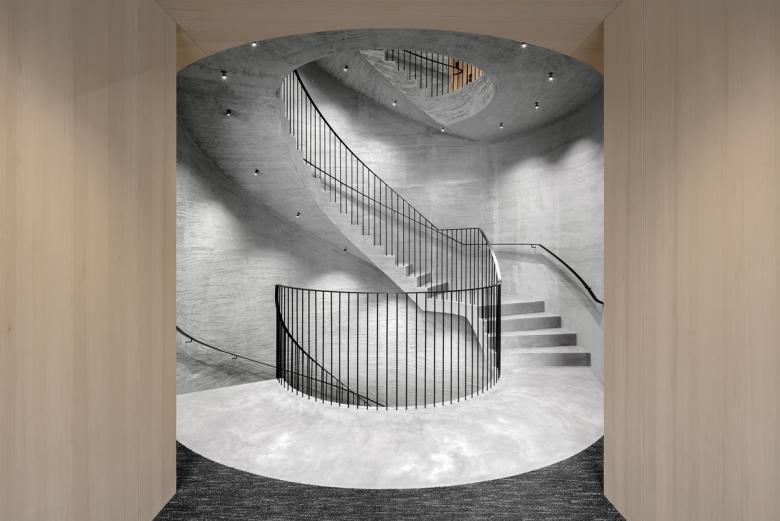 Das mächtige und kompakte Volumen des Hauses hat es erlaubt, das Stiegenhaus großzügig zu gestalten. Das Auge reicht bis auf die Ebene der Tiefgarage, um diese aufzuwerten. Die Materialität steht in bewusstem Kontrast zur hölzernen Hülle des Hauses. Böden, Wände und Decken sind in gespachteltem Ortbeton materialisiert. Hölzerne Nischen schaffen Adressen für die Mieter.