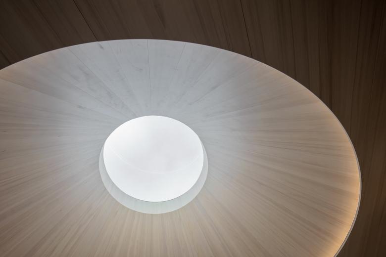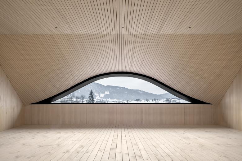 Die großzügigen und regelmäßig angeordneten Lochfenster sorgen zusammen mit einer Raumhöhe von 2,80m für eine gleichmäßige Belichtung bis zum Kern des Gebäudes. Die Lochfenster sind individuell zu verschatten, die tiefen Leibungen und die geschossweisen Auskragungen sorgen zudem für einen konstruktiven Sonnenschutz. In nächster Nähe zum Oberlicht des Stiegenhauses gibt es als Ergänzung des Besprechungsraumes eine gedeckte Dachterrasse, die einen klar begrenzten Bezug zum Gemeindeplatz im Süden ermöglicht. Die tradierte Form der Fledermausgaupe erschien uns als das richtige Motiv, um einen fokussierten Raum und gleichzeitig eine zurückhaltende Zentrierung des Hauses zu schaffen.