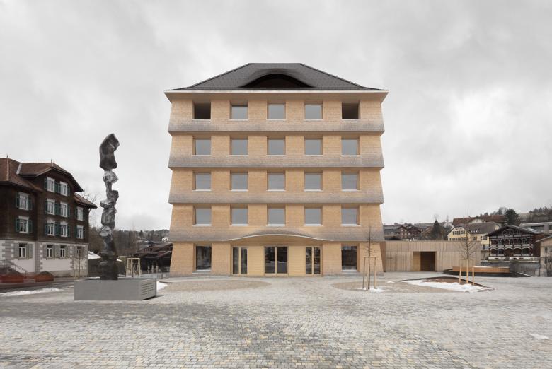 Das »Posthus« in Egg ist das neue Tor zum Bregenzerwald. Der kräftige, punktförmige Baukörper mit Walmdach schafft einen neuen Fixpunkt im Ortszentrum von Egg im Bregenzerwald in Vorarlberg. Durch die Positionierung des Baukörpers wird auch die Kirche Teil des Dorfplatzes. Die Höhe ist mit über fünf Geschossen herausfordernd, aber die zentrale Position im Ort und die Tatsache, dass die Kirche noch deutlich höher steht, lassen die Höhe richtig erscheinen.