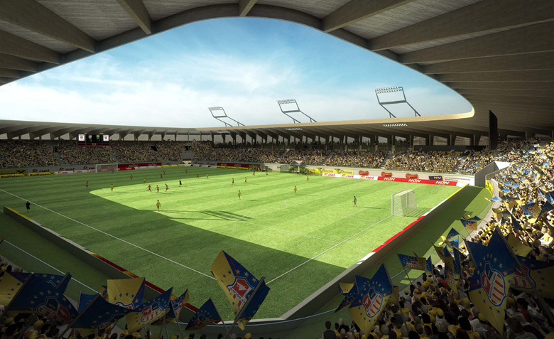 Wer das Stadion über die erhöhte Promenadenebene betritt, kommt in den windgeschützten Kessel, der sich zum Spielfeld mit durchgehenden homogen Rang zu einer kompakten, atmosphärisch dichten Arena entwickelt.