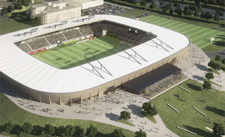 Das neue Stadion St. Pölten ist als weithin sichtbare, unverwechselbare städtebauliche Großform konzipiert, die oberhalb des Sockels vollständig als Holzbau ausgeführt wird. Eine korbartige Holzstruktur bildet die Gebäudehülle, filtert das durchtretende Tageslicht und bietet gleichzeitig einen wirksamen Windschutz.