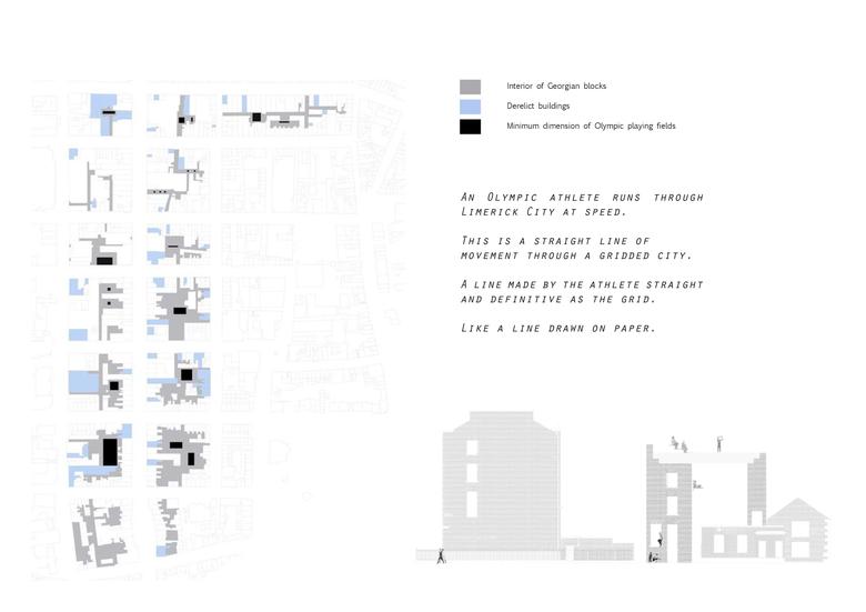 My thesis proposes to build a layer of Olympic infrastructure on top of the city of Limerick. This layer will be built on top of the existing Georgian grid. The stadia are built in a way that what will be left behind is civic space, it is for the city and it’s citizens. Stadia will be built in the centre of the city blocks. Infrastructure will step down into the block and continue over the Georgian houses and work down into the city streets. How can the city shape these lines that we draw. It is Limerick city that shapes the Olympics. The Olympic venues are site specific. The idea of giving the city another layer, a system of sport brings life and opportunity. Limerick is a city in the south west of Ireland an Olympic venue with a difference. Limerick’s MP Edmond Sexton Pery commissioned an Irish engineer Christopher Colles to design a town extension New Town Pery in 1769. This Georgian grid now makes up Limerick city centre. The way in which Colles designed the grid was to allow for the city to efficiently develop and expand. This has not happened the life of the city has seeped from the core and spread to the edge lands. In this thesis the Olympics does not create white elephant stadiums on the edge lands of the city but a system of lines of civic sport interlocked with the fabric of the city. These Georgian housing blocks have different interiors of mew lanes, sheds, garages and car parks. This is un-utilised space with great potential in the very centre of the city. This is the location of an Olympic boxing final? Limerick is a Georgian Grid and the sports infrastructure fits into this grid. The city becomes pedestrianised for the Olympics. Businesses and people living in the blocks become a part of the games and afterwards the arenas are there to be utilised by these citizens. These are not just sport facilities for the elite athlete but for every Limerick citizen young and old. This is a way of expanding a city with a systematic layer of infrastructure. This Olympics breathes life back into Limerick allowing the city to grow and expand to it’s full potential.