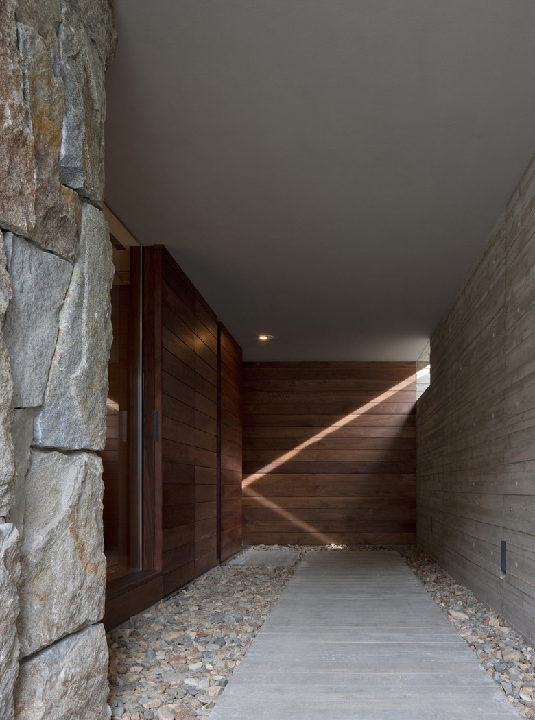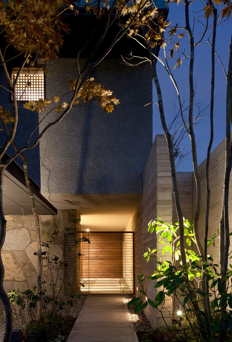 植栽が配された長いアプローチの奥、差込む優しい光に導かれ、日常の喧騒から離れたところに玄関がある。