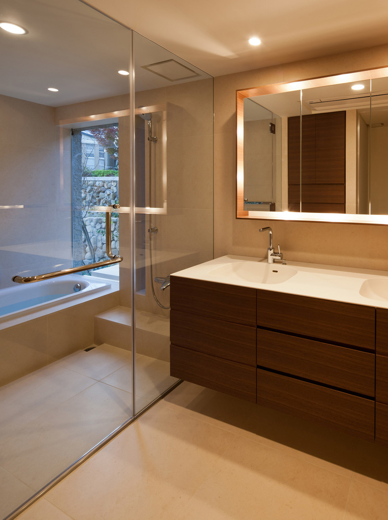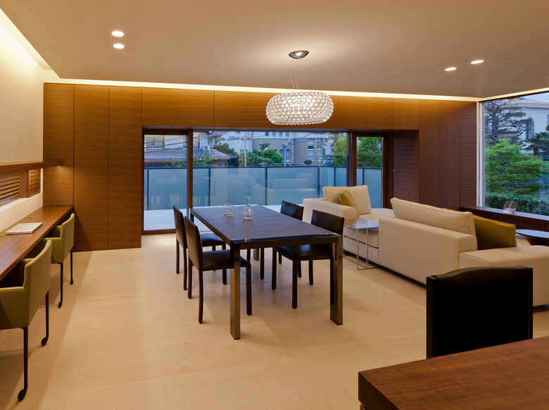 扉を開けると既存石貼塀と連続する庵治石壁と無垢板貼の壁に囲まれた空間が広がる。ここはゲストルームも兼ねたバレエの練習室であり、鏡の壁面が空間の広がりを感じさせてくれる。建蔽率40%の規制と高度斜線制限をクリアするため擁壁を建て地盤面の操作を行った。