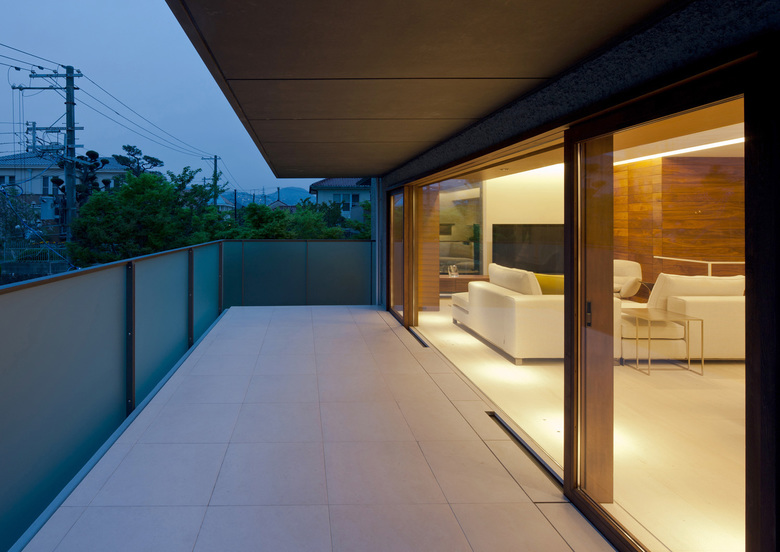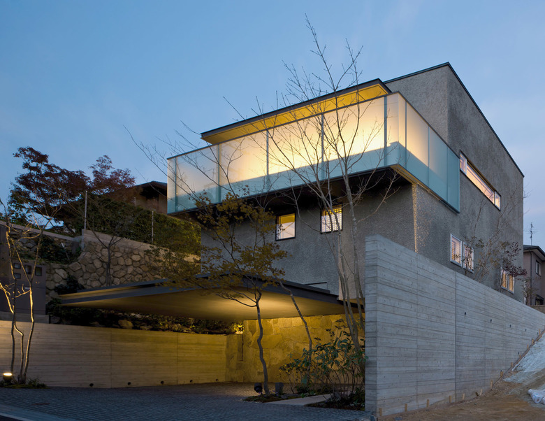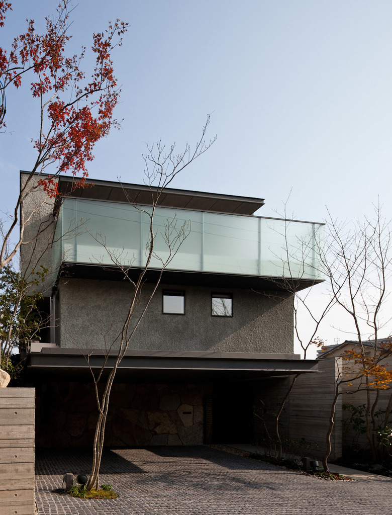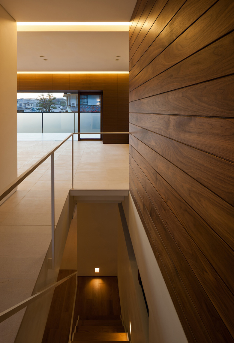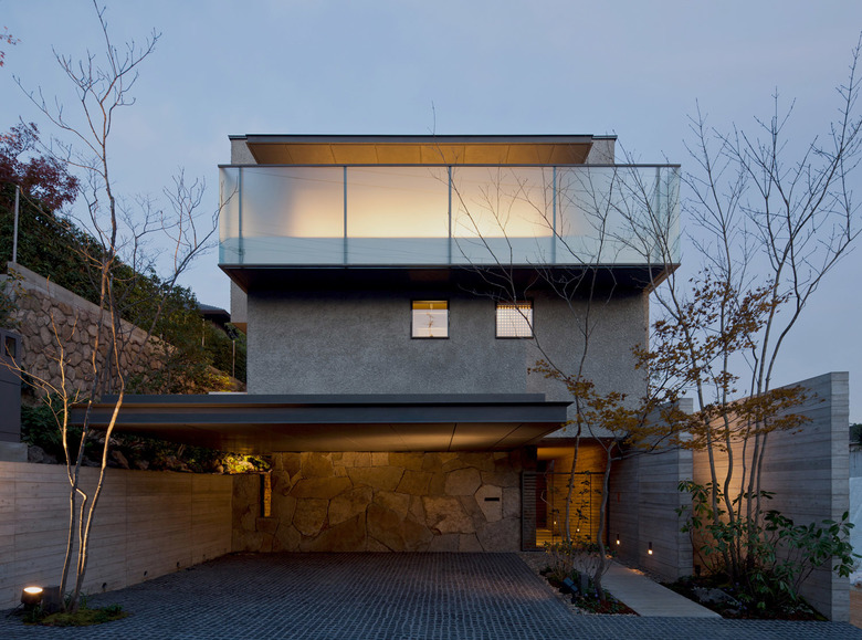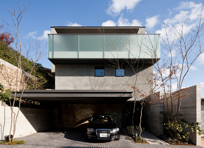 この敷地に対して、仲の良い施主ご家族は皆で過ごせる気持ちよい空間を希望された。辿り着いたのは街に開放されたオープンスペースと六甲山の山並みを見渡す3層構造。建物のヴォリュームを敷地奥に設定し、道路に対して圧迫感を与えないよう配慮した住宅である。