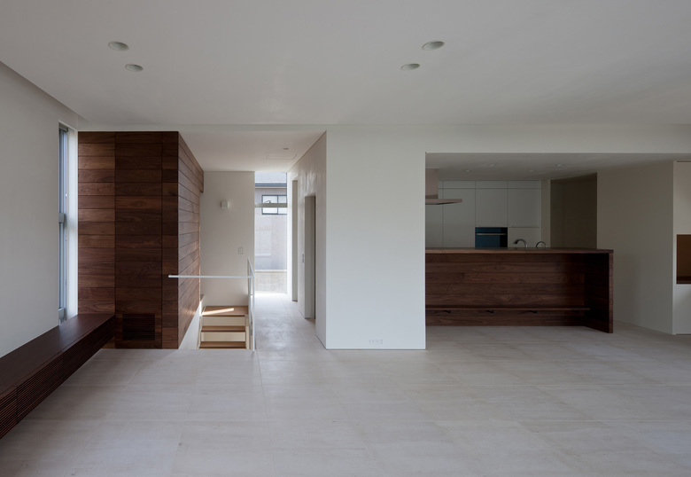 眺望と風の抜け、西向きを考慮して壁面収納で開口を低く抑えることで、西日と共に深い庇の存在感も和らげている。北側の借景を取り入れた開口計画が隣地の植栽を通してさらに視覚的効果を高め、日々の生活に気持ちよさを与えてくれるだろう。各階をずらしてヴォリュームの抜けを創り出し威圧感を抑えながら、容積確保の両立を意図している。