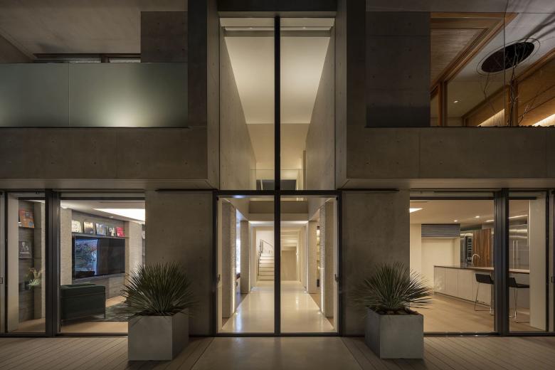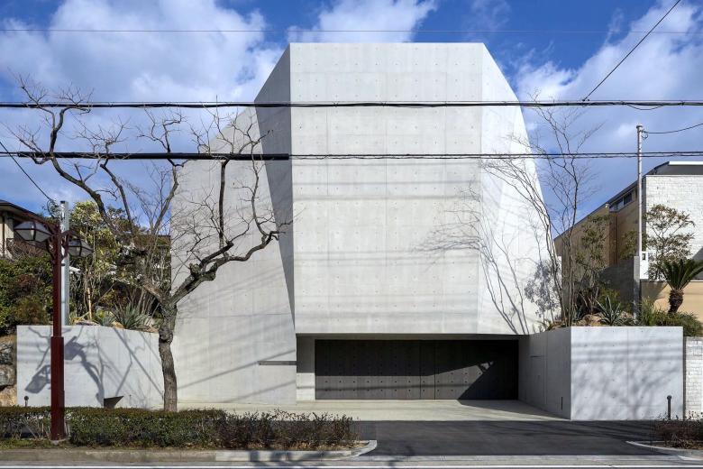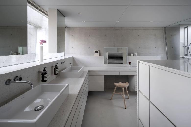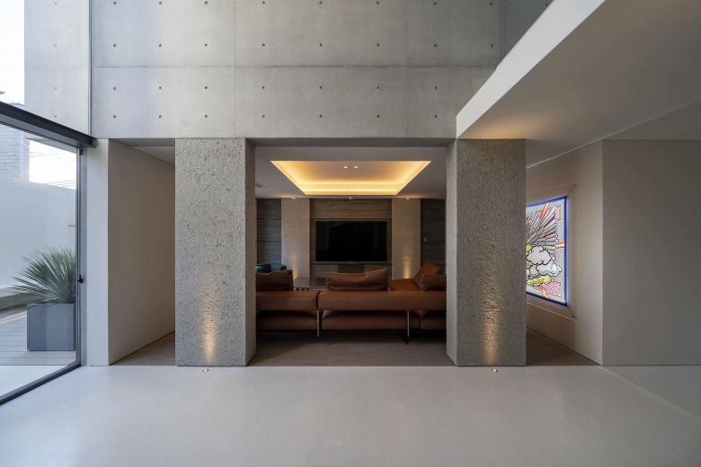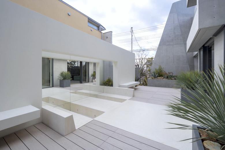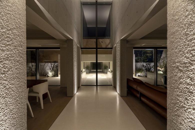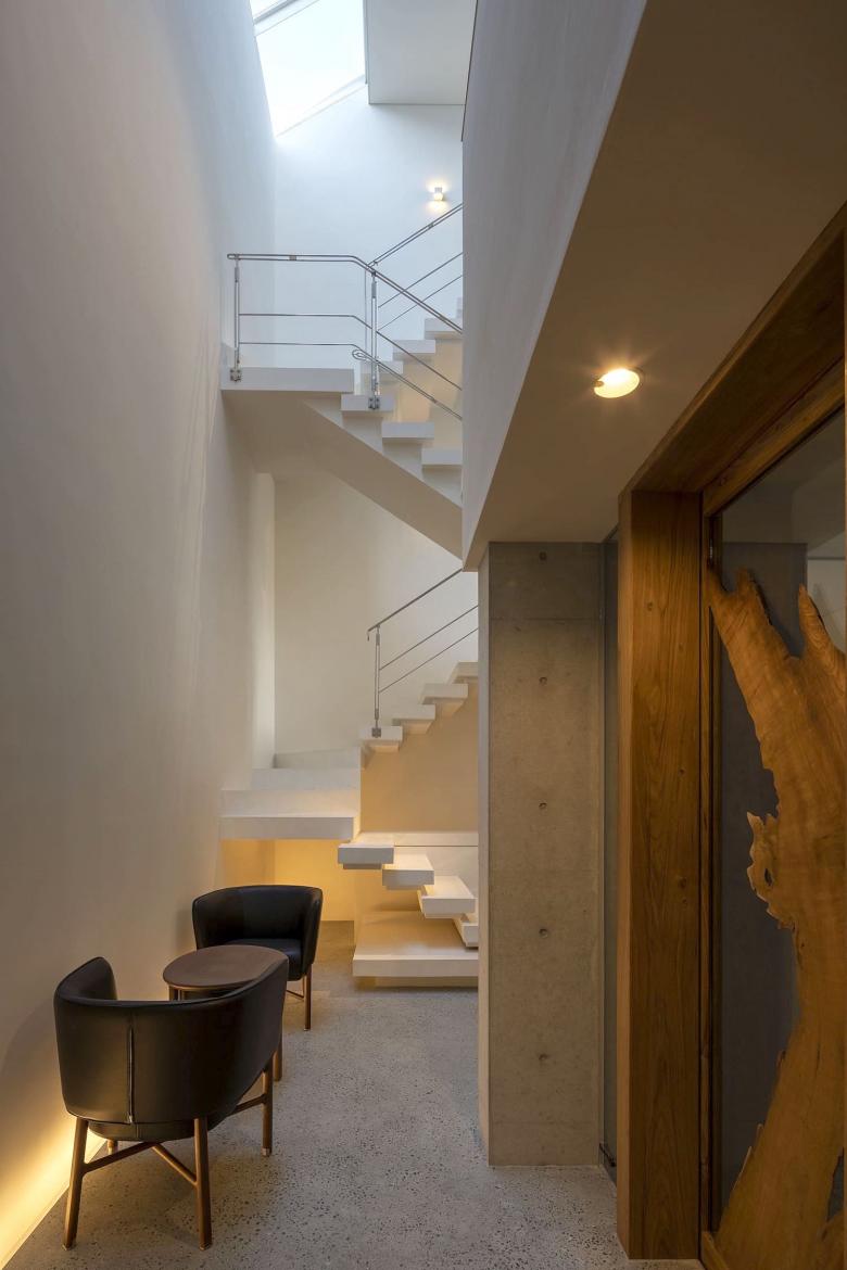 玄関で最初に目に飛び込んでくる階段は巨匠カルロ・スカルパからインスピレーションをうけ、複雑な立体をコンクリートでつくるという挑戦であり、石灰岩モルタルを研ぎだして仕上げ、階段そのものがアートとなることを目指した。