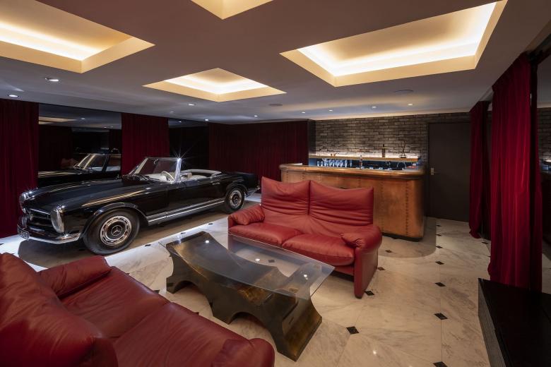 そしてひときわ異質なのが地下階のバーである。酸化させて風合いを出した銅貼のカウンターを中心にアンティークレンガ、ベルベットカーテン、ダークミラーをつかって1970年代風の世界観を演出した。ネオンサインがあやしく輝く。