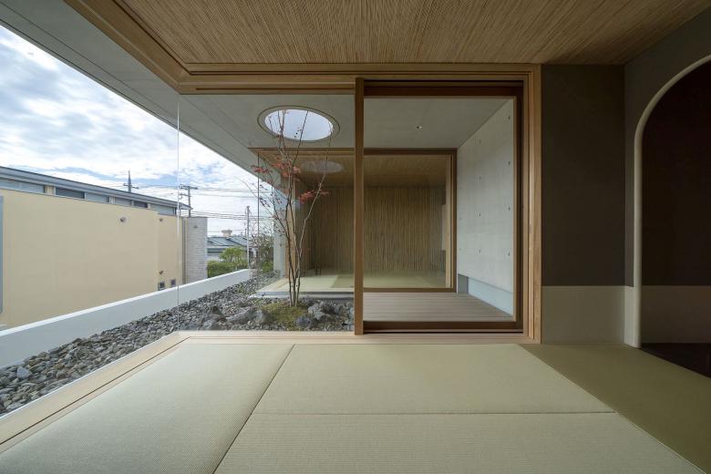 客室は中庭の軒天に正円に抜き取られた空を中心とした双子の和室。お互いを借景としあうこの双子はそれぞれに静謐な世界観と奥行をもたらしあって存在している。