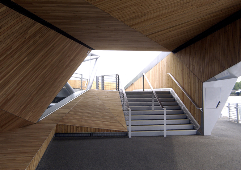 2. By developing an architectural concept that integrates the ramp, steps and pontoon shelter within a single folded form defined by continuous surfaces of plate steel, more akin to a stealth boat than the traditional floating pontoon toped by an unrelated shelter.