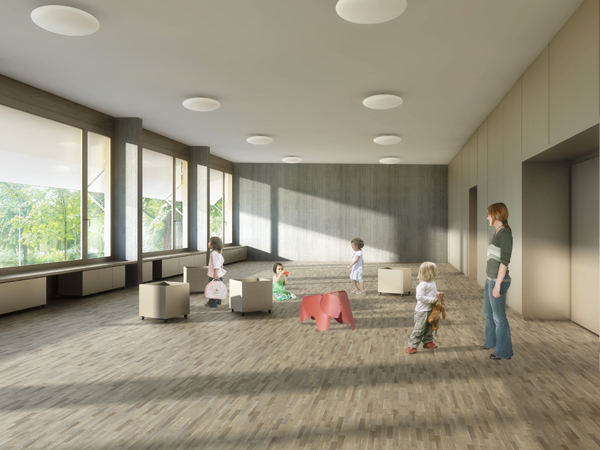 Im denkmalgeschützten Schulhaus konzentrieren sich die baulichen Interventionen auf den Einbau von zwei Gruppenräumen, die Erneuerung der WC-Anlagen im Erdgeschoss und kleineren Anpassungen im Lehrerbereich.