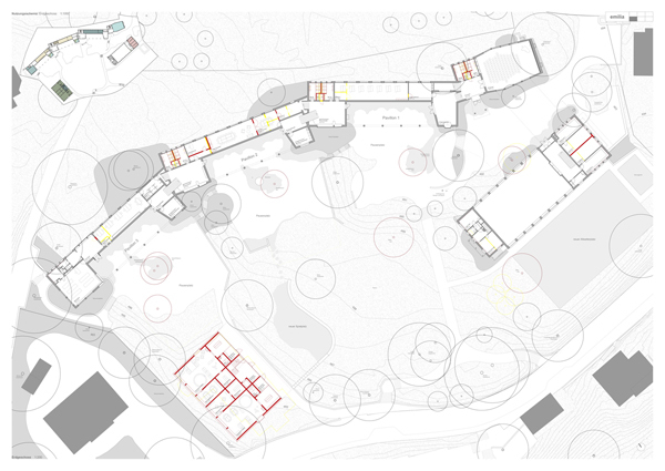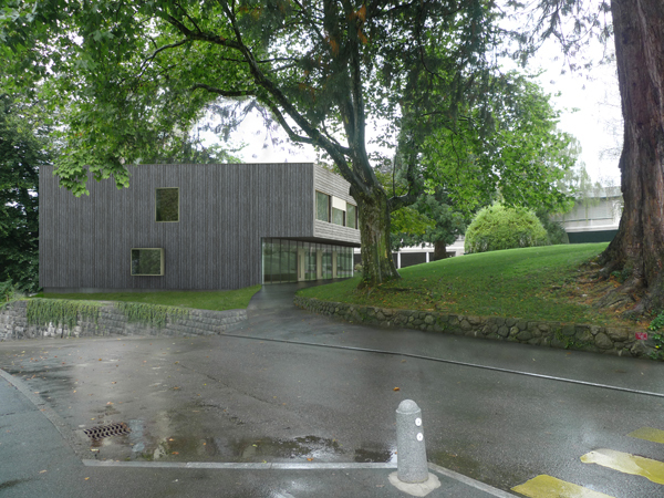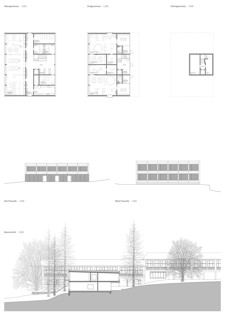 Die Schulpavillons formen einen Rücken, der sich auf die parkähnliche Landschaft ausrichtet und mit terrassierten Pausenplätze dem Terrainverlauf folgt. Der neue zweigeschossige Minergie-Neubau sitzt als Abschluss der topografischen Staffelung am südöstlichen Rand des Planungperimeters.