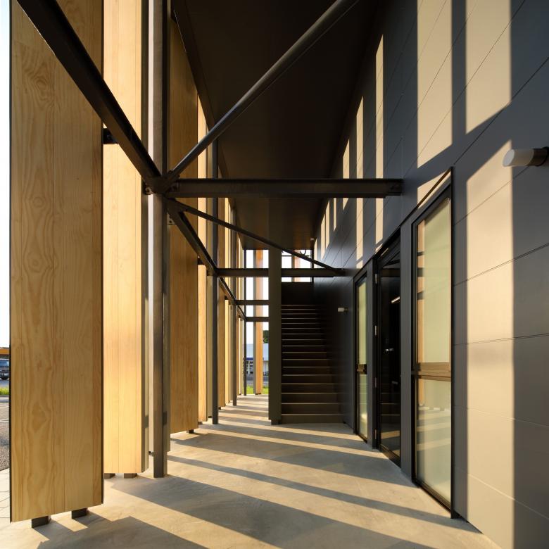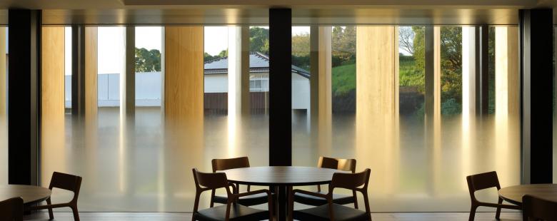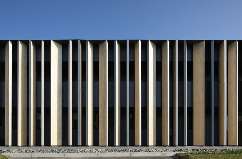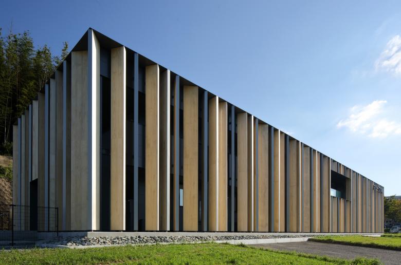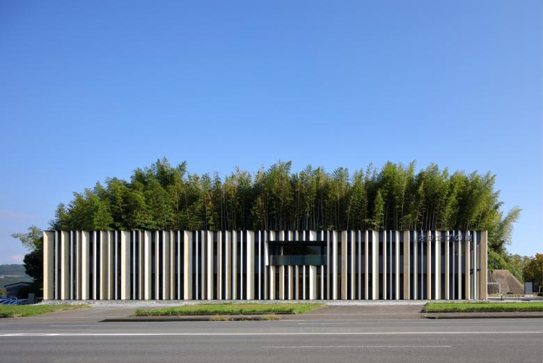 背後の竹林と調和する外観。木製ルーバーにより、内外を優しく連続させる。