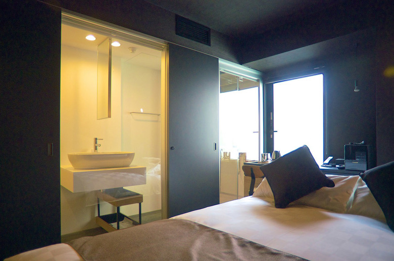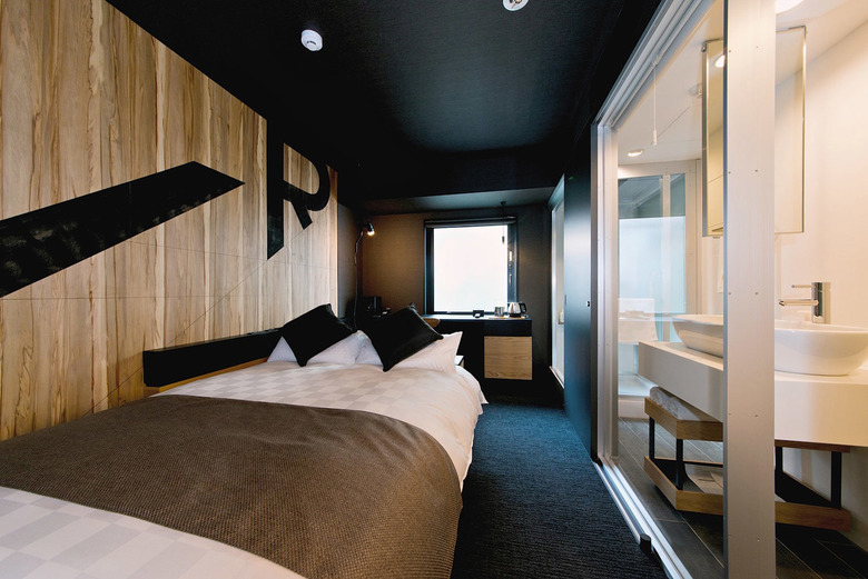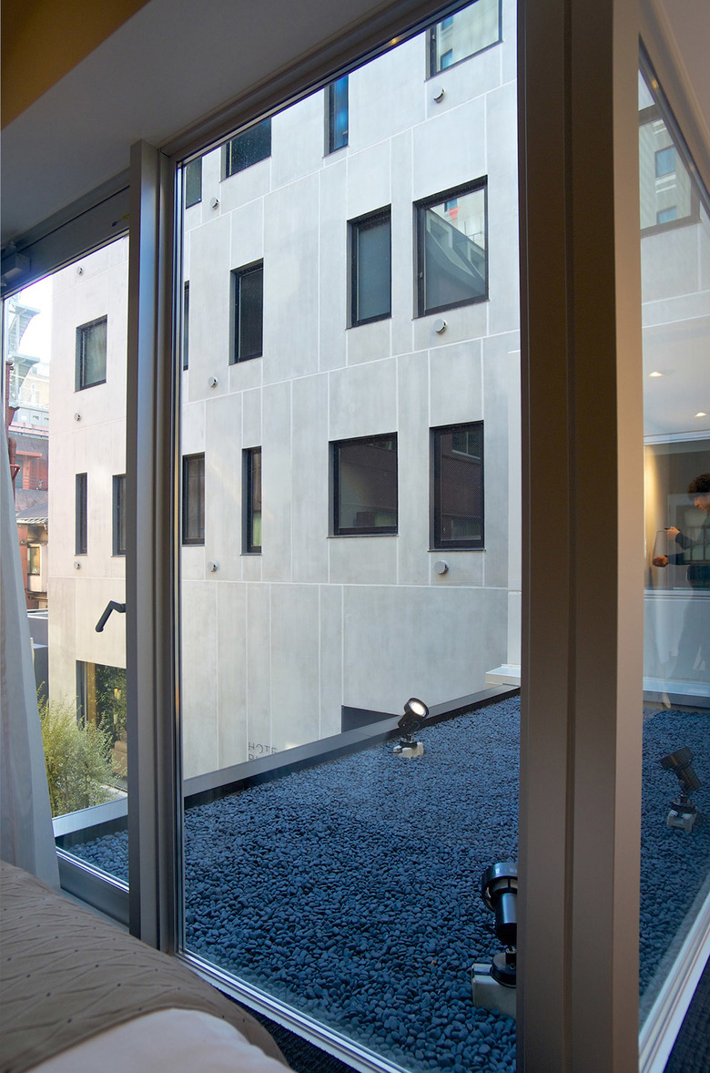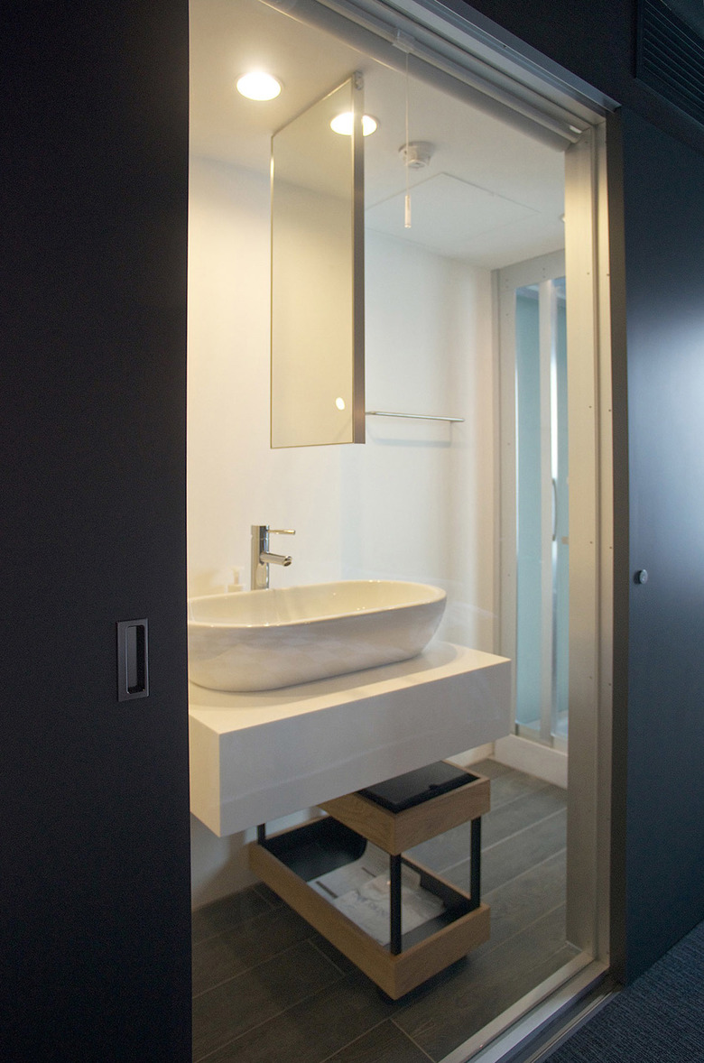 都心に於いて限られたスペースを最大限活かすことは重要な課題だ。ロビーはガラス壁越しにレストランにまで視覚的に拡張されるよう計画している。基本的な客室は二種類のユニットからなる。双方とも水廻り部分を取り込むことで寝室部分を拡張する試みだ。ひとつは水廻りを細く帯状に配し、全面をガラスで開放する。シャワーユニット、洗面、トイレがあたかもショーケースのように並ぶユニークなレイアウトだ。もうひとつはシャワーユニットを中心に入れ子状に構成し、引戸を開放すると自立壁のようになり、寝室と一体的に感じられるよう意図した。