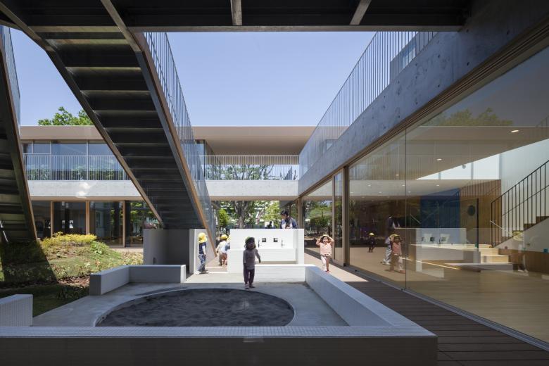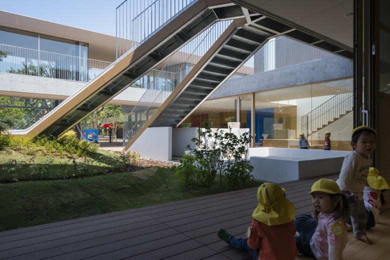 雑木林の南側に設けられた保育園はモミの木と滑り台や築山,砂場のある中庭を囲んだ回遊式の園舎であり,透明性が高められ,死角がほとんど無い,安全な,しかしながら閉塞感の無い快い開放感と暖かく包み込まれた安心感を併せ持つ,大人でも快く感じられる環境が整備された。