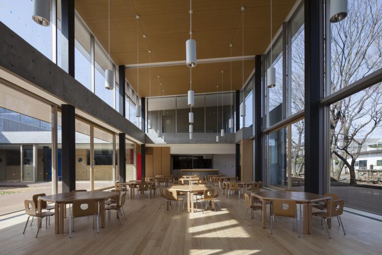 中庭を取り巻く玄関ホール,回廊,保育室では穏やかな光と内外を吹き抜ける微風をいつも体感することができる。なかでも雑木林に沿って設けられた2層の高さを持つランチルームでは,ケヤキの梢を感じながら,楽しく食事や会合に参加することができ,子どもも大人も心が解放される豊かな体験を与えられる。