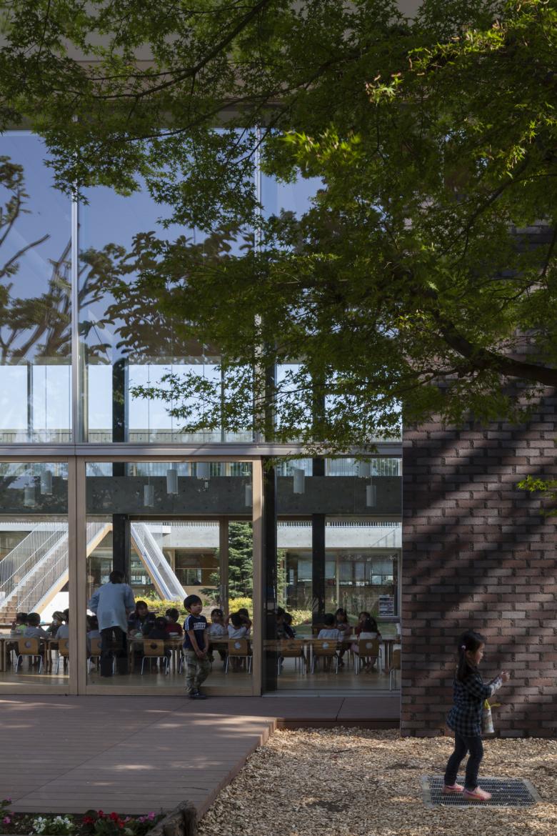 幼稚園と保育園の敷地の東の駐車場を含め外部の喧噪から子どもたちの生活の場を守るためにレンガタイル仕上げの隔壁を設け,そこに開口を穿ち,幼稚園と保育園両方への門とした。その開口を通して,外部環境と雑木林のある子どもの世界とが通じ合うことになった。壁を抜けると,そこには幼稚園と保育園の子どもたちがのびのびと生活する環境が整えられている。