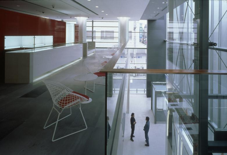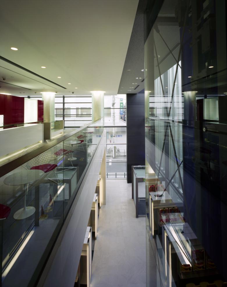 また,旧川越街道側の北面は小割りの街並みにスケ−ルを与えるため垂直性を強調したガラススクリーンとし,上部はフロスト加工を施し,北側の安定した光が内部空間に拡散するように計画した。西面は奥行きのある庇状のサッシにより,深く差込む西日を反射拡散し,階段の領域を穏やかな明るい空間とするとともに水平方向の拡がりを与えた。