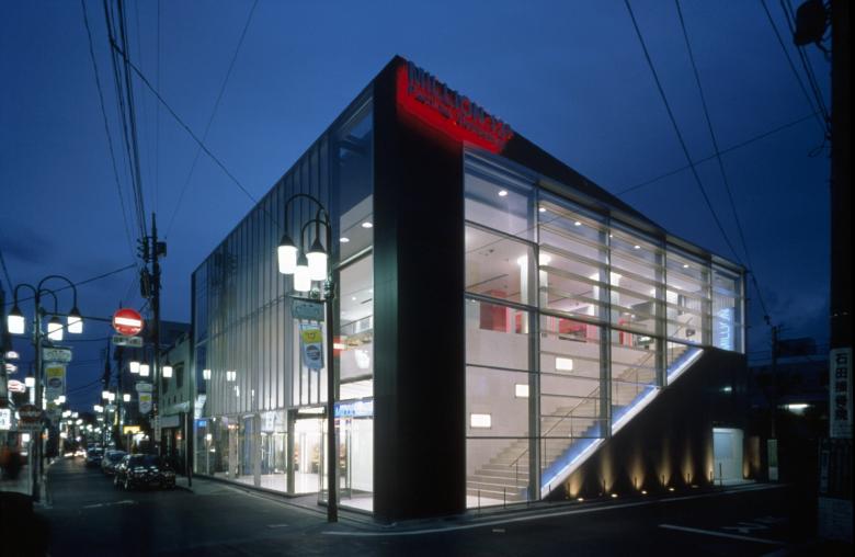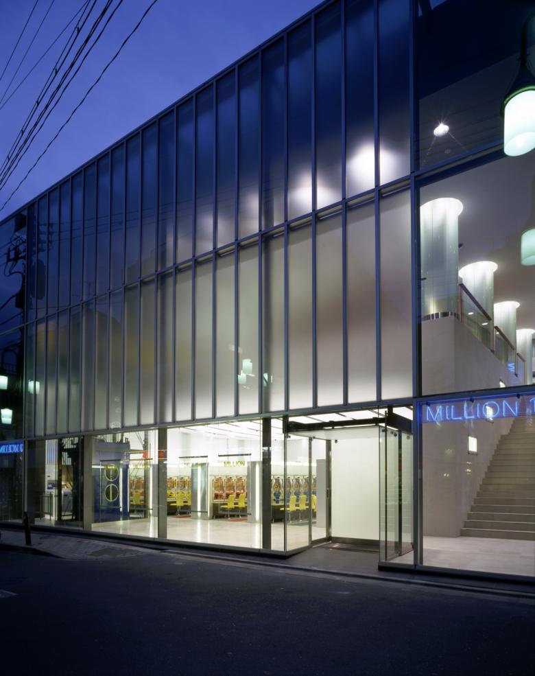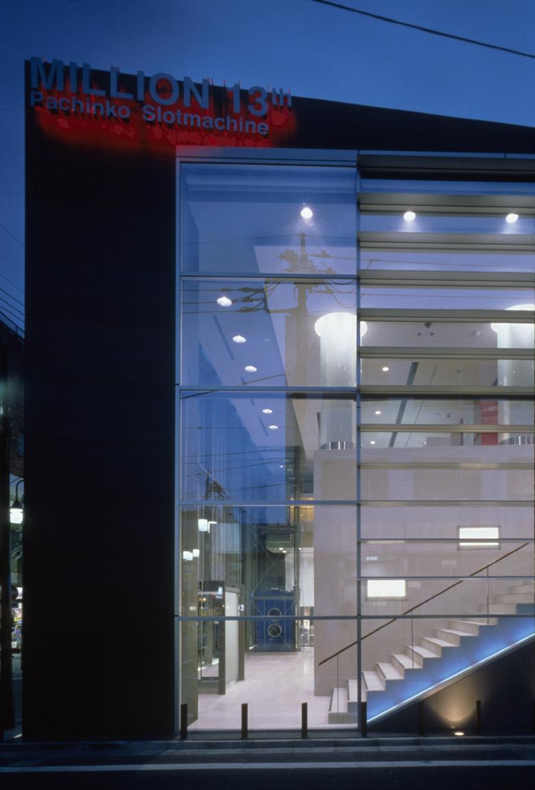この建築は旧川越街道に面するT字路の角地に立つパチンコ店である。周囲には昔の風景を思い起こさせる家並みはすでに無く,特徴の無い小割りの店舗が連なり渾沌とした街並みをつくりだしている。設計に当たり,このような風景の中に潜むこの敷地に内在するエネルギ−を顕在化させ,街並みに活力と秩序を取り戻す端緒となる建物の実現を目指した。