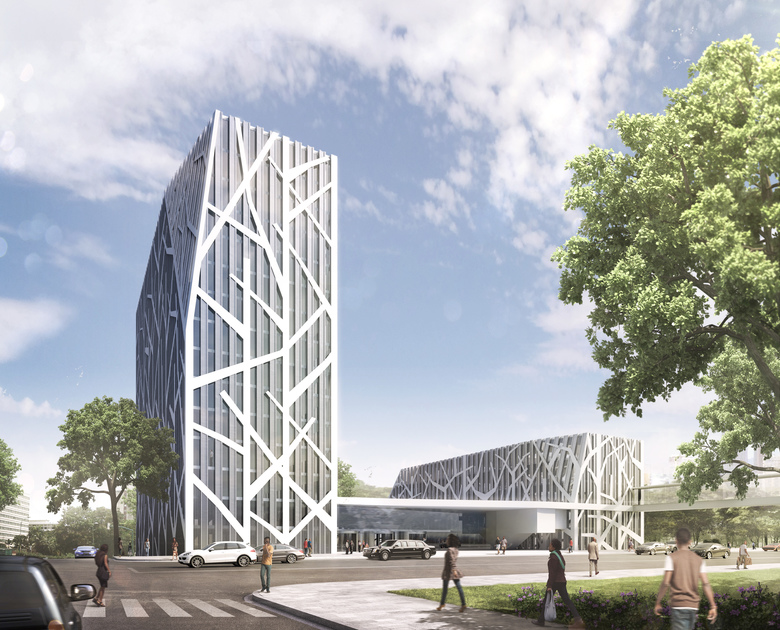 El edificio de oficinas se desarrolla en un volumen prismático que ocupa todo el frente del solar que mira hacia la Gran Mezquita. Se propone un edificio de catorce pisos de altura y 18,60 m de profundidad, dimensión que permite una ventilación transversal eficiente y un óptimo nivel de iluminación natural. En el frente opuesto del zócalo, el edificio de servicios se desarrolla en un volumen exteriormente simple, cuya complejidad interior responde a la diversidad de funciones que acoge. En sus seis plantas se distribuyen los diferentes servicios –área de restauración, agencia de viajes, correos, reprografía, agencias bancaria, guardería, centro médico, área de fitness y salas de oración–, así como los espacios de vinculación entre el conjunto de edificios que constituyen la nueva ampliación que se proyecta y la actual sede del BAD. La sala de conferencias ocupa el espacio central entre los dos edificios en altura. Su espacio de acceso comunica y relaciona todas las piezas del conjunto, al tiempo que facilita el uso independiente de cada espacio y articula las circulaciones de usuarios y visitantes con sus correspondientes controles de seguridad y acceso. El proyecto prevé que tenga una capacidad total de 1.200 personas, modulada y divisible en salas de distintos tamaños.