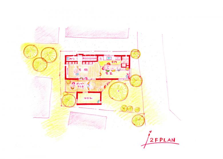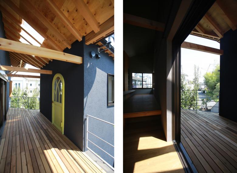そこで2階の敷地のほぼ中央に、大きな屋根だけかかっているインナーテラスを設け、その向こうに多目的に利用できるはなれを計画しました。