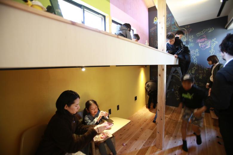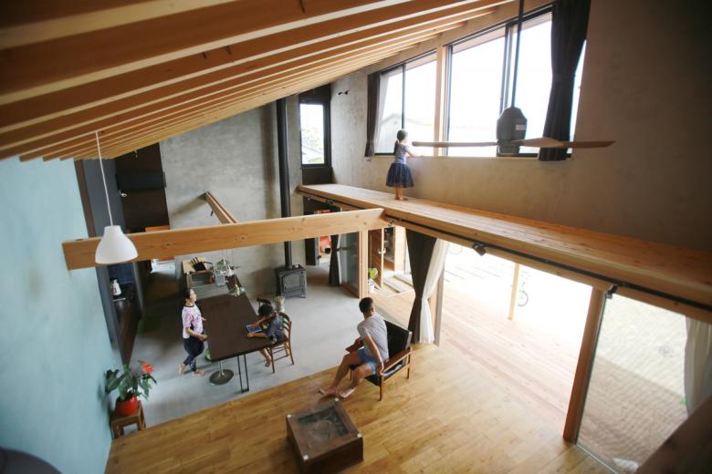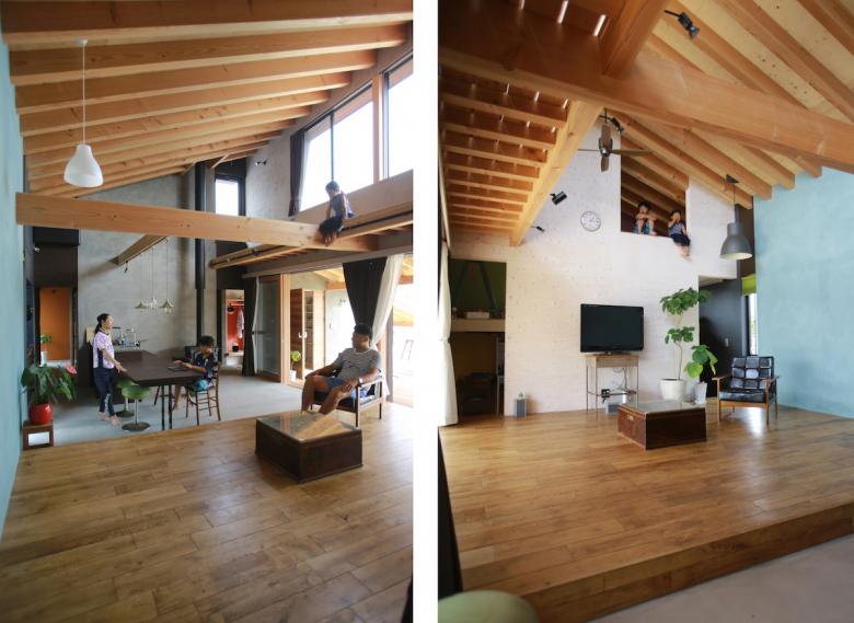 家の内部からも下屋根に出られるため、家の内部、下屋根の上、地面までを巻き込んだ、立体的な大回遊動線が誕生した。緩い勾配の屋根の上は、子供達が走り回り、寝っころがり、お昼を食べ、とまるで公園の丘の上のようだ。全体からすれば、ほんの少しだけ下屋根を地面近くまで差し出した事で、屋根の上にいる恐怖心を一掃し、むしろ地面の続きの場所にいるかのような安心感を生み出している。庭でサッカーのミニゲームでもする時には、屋根の上がスタジアムの観客席になる事だろう。