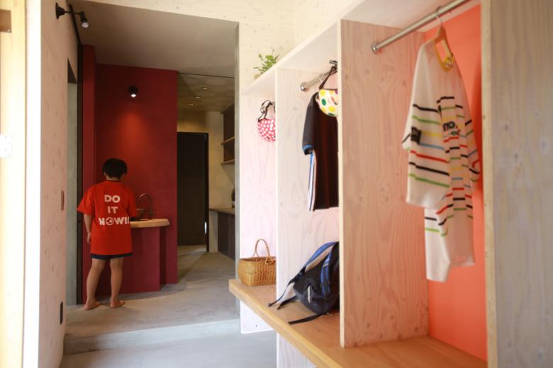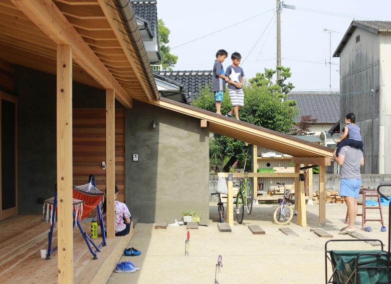 そこで、南側に設けた深い下屋根の一部を、地面に限りなく近く延長させる事で、平屋よりもさらに低いスケールの佇まいで空き地と街に構える事にした。その下は自転車置き場とし、簡単な台を利用すれば、子供でも容易に屋根の上に登れるようにした。