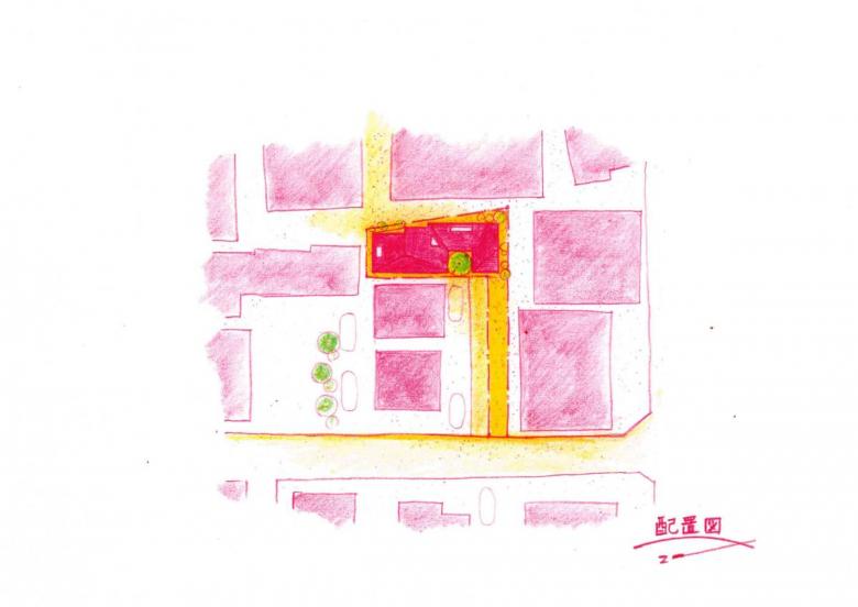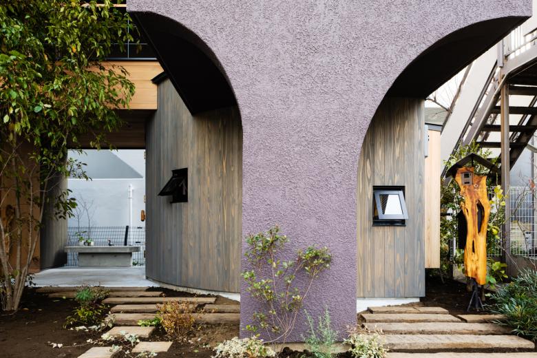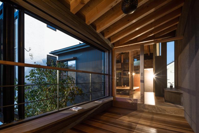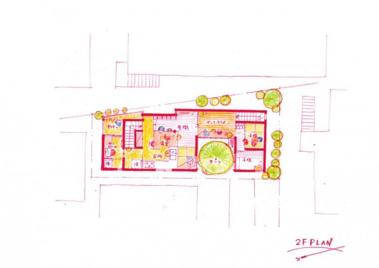 そこで全体は中庭を囲んだようなコの字のボリューム配置にして、まずはプライバシーを確保するようなイメージを作った。その上で地続きな街との連続感も感じられるように南北の棟をつなぐ場所を 1階はピロティーに、2階はインナーテラスにする事で一軒家なのに母家とはなれを行ったり来たりするような生活像を提案した。