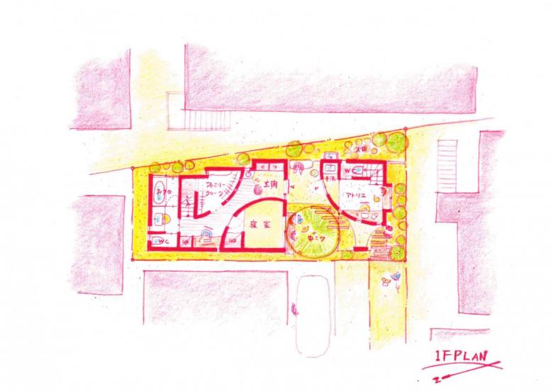 1階にはピロティーを挟んで玄関とは別にアトリエへの出入り口もあり、階段も家の中に二箇所計画。 立体的にもぐるぐると回遊でき、子供も大人もその時々で好きな場所で過ごすことができる。