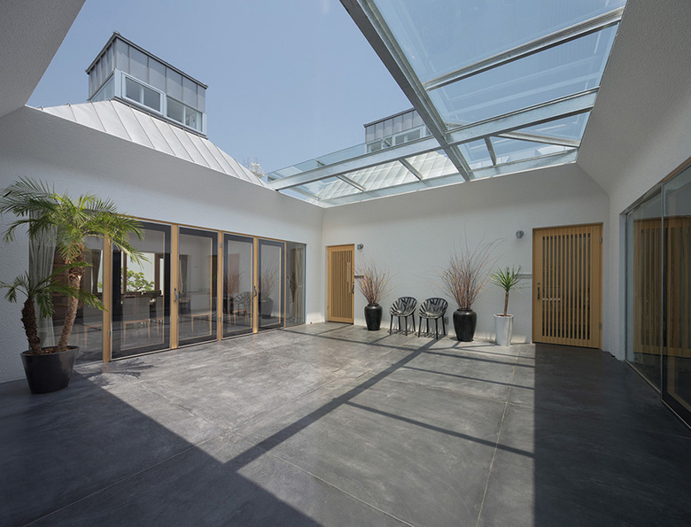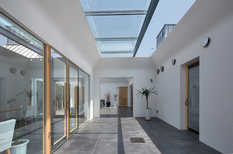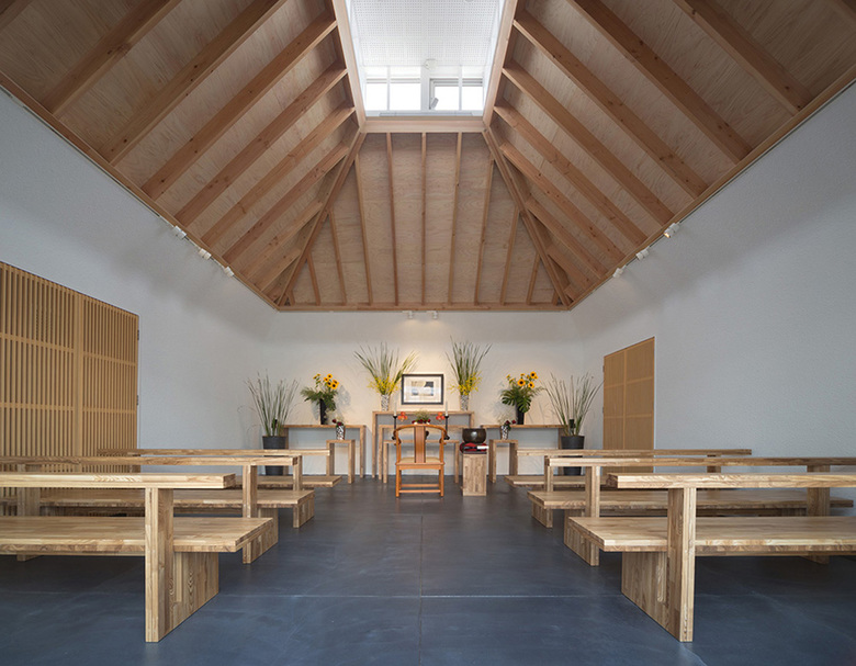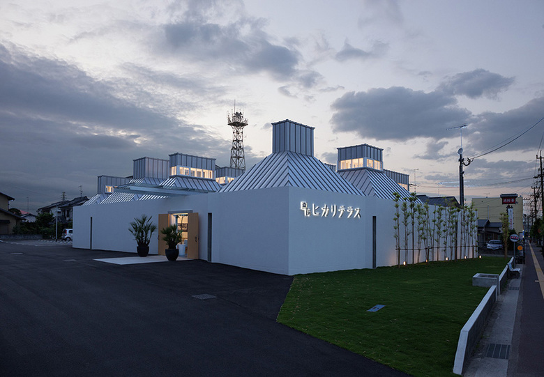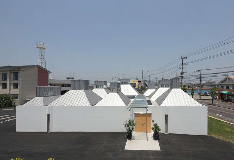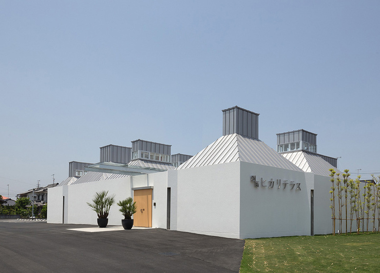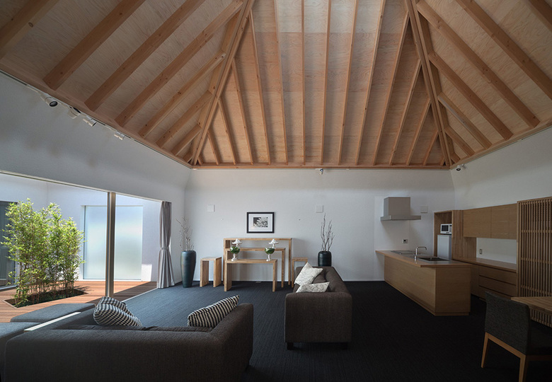 建物は小さな屋根が集まってできた集落のような造りである。客室、式場、食堂、事務室といった各部屋が一つの屋根の単位となっており、お互いを中庭でつなげることで構成している。各部屋は、外部とは開口のないRC造の壁で閉ざされているが、それぞれがプライベートな中庭を持ち、中庭に大きな開口を設けている。そうすることで室内環境を整えながらも、中庭からは空だけが見え、喧噪な外界とは切り離された非日常的な空間とした。