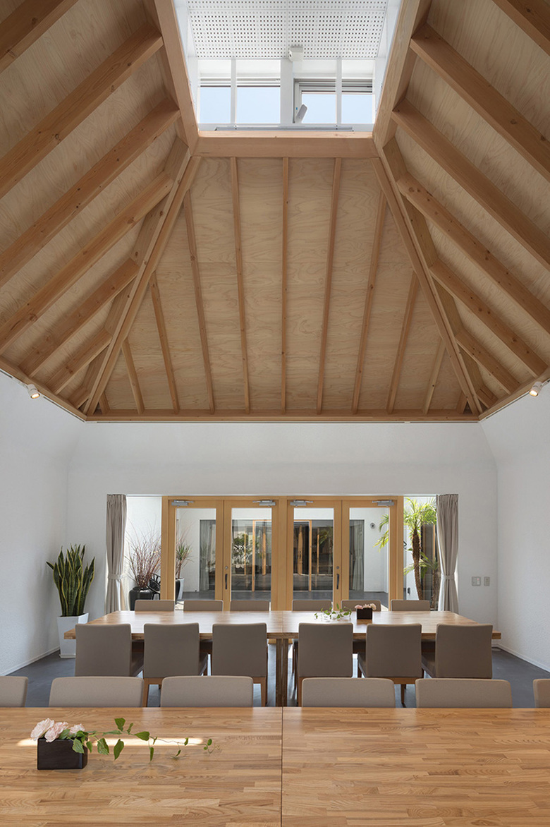構造は壁式RC構造であるが、屋根を木造とすることで、建物の重量を軽くするとともに木の暖かみがある空間とした。壁の頂部にY型の梁をのせて木造屋根の土台としているが、Y型の梁が水平剛性を確保しているので、水平方向の補強無しに大きな寄せ棟の架構を可能にしている。また、Y型梁は屋根からの雨水を処理する樋としても機能しており、最終的には外壁まわりに設けたオープン樋から雨水が排出される。屋根頂部にはハイサイドライトを設けており、柔らかい採光と効率的な自然換気を行っている。