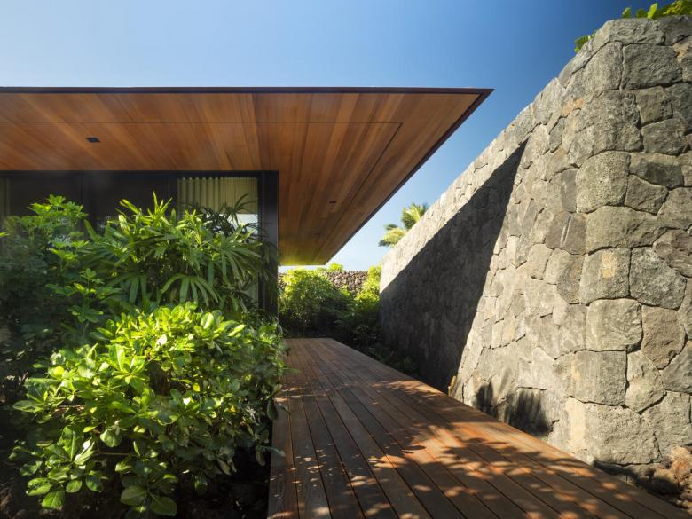 Cantilevered double-pitch roofs in the Big Island style create deep canopies that encircle the buildings and their lanais, allowing the pavilions to open completely to ocean breezes while protecting from solar gain. Operable shutter screens let the family tune each building to changing environmental conditions, adjusting to the desired degree of sun, air and privacy. Rock walls in many of the pavilions extend outdoors, connecting the home to the Kona landscape. Custom-designed furniture and interior elements throughout complement the architecture with subtle Hawaiian references.