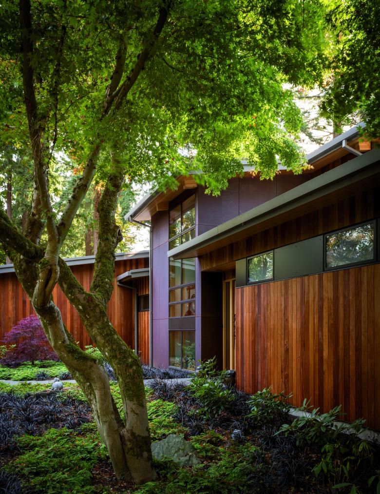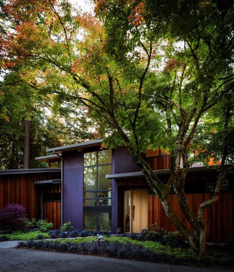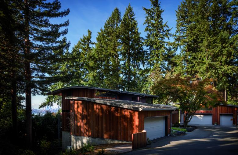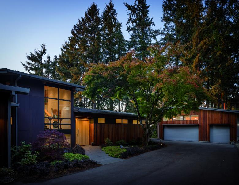This single-family home for a couple with young children provides an open, flexible living space that supports family life, as well as an adjacent workshop and garage for the owner’s avid interest in car restoration. Gently curved roof forms are inspired by the topography of the site and Lake Washington’s undulating shoreline, creating a sculptural grouping of buildings on the site. A light approach to landscape preserves the site’s existing trees, including a Japanese maple that frames the front entry. Durable materials provide long-term, low-maintenance protection against the wet climate.