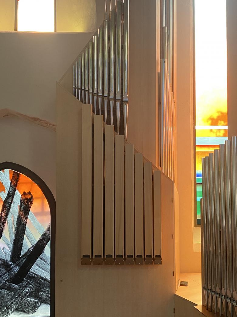> Die zweimanualige Orgel wird im Optimum zwischen akustischer und räumlicher Einordnung als besonderes raumgreifendes Objekt im Südwestwinkel spannungsvoll platziert.