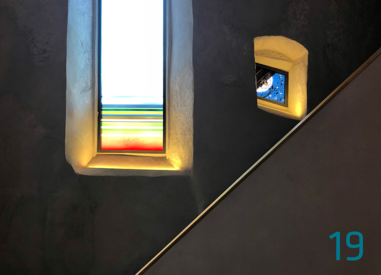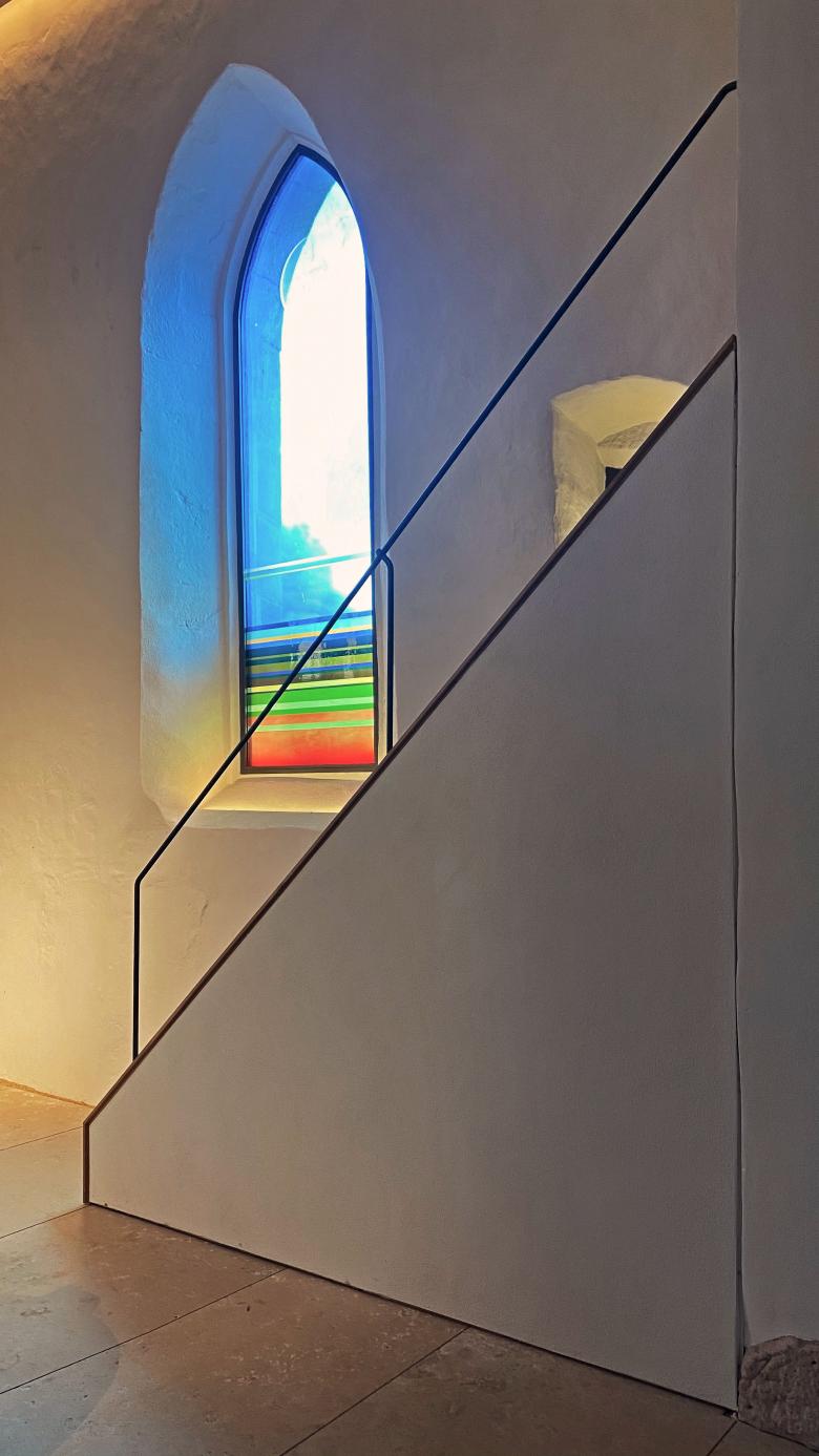> Im Vordergund stehen die Fenster, die in ihrem Formenreichtum und ihrer unregelmäßigen Anordnung raumprägend sind. Künstler Julian Plodek transformiert in der Neugestaltung das ganze Universum zwischen weltlichen und kirchlichen Bezügen sowie zwischen abstrakter und bildhafter Darstellung, eingebettet in die Naturdarstellung: im Norden als grafische, im Süden als malerische und zudem inhaltlich motivische Prägung. Schmale Stahlrahmenfenster mit Thermoverglasungen wurden so zu transluzenten „Leinwänden“.